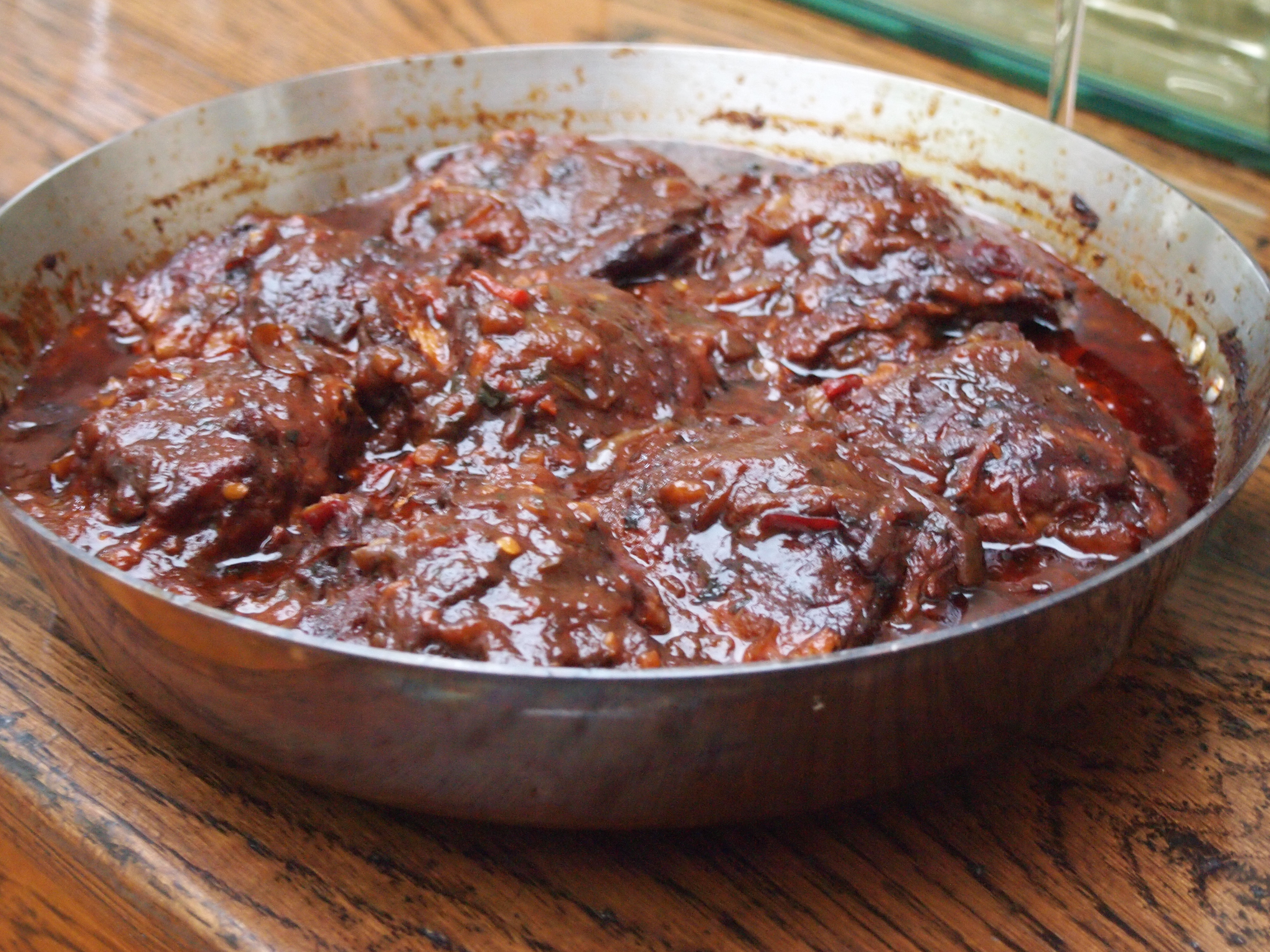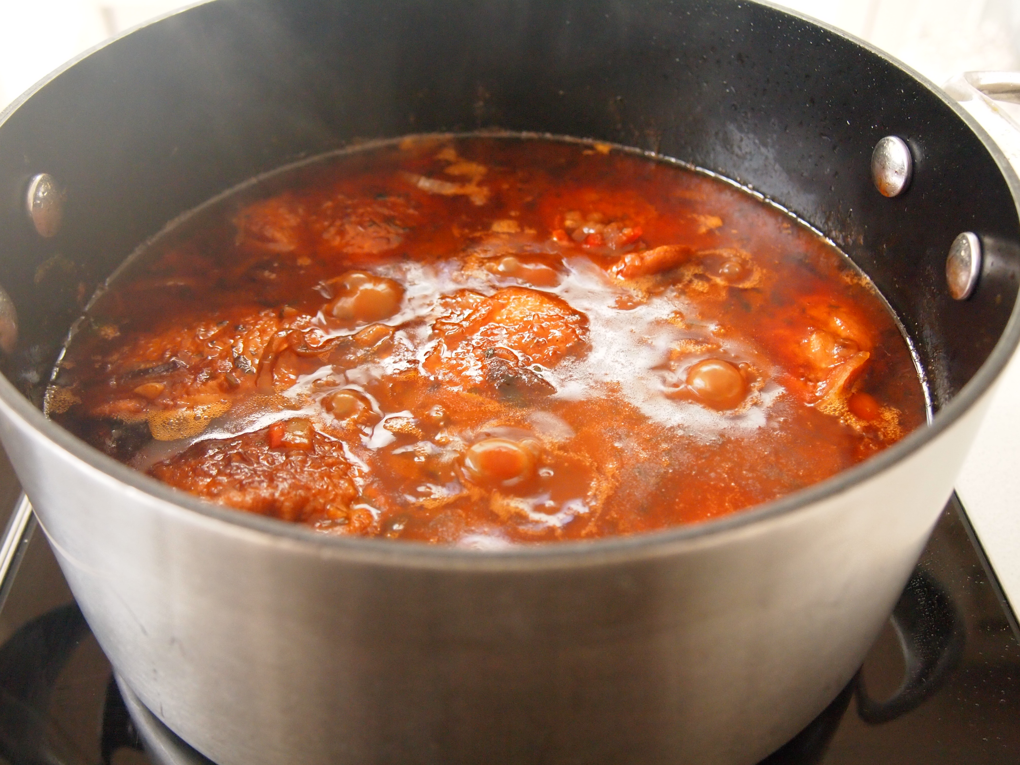 Simmer for 45 minutes – 1 hour, until the chicken is falling off the bone and the sauce has thickened. Check often to ensure it’s not sticking and if the sauce is getting to thick add another tablespoon or two of water.