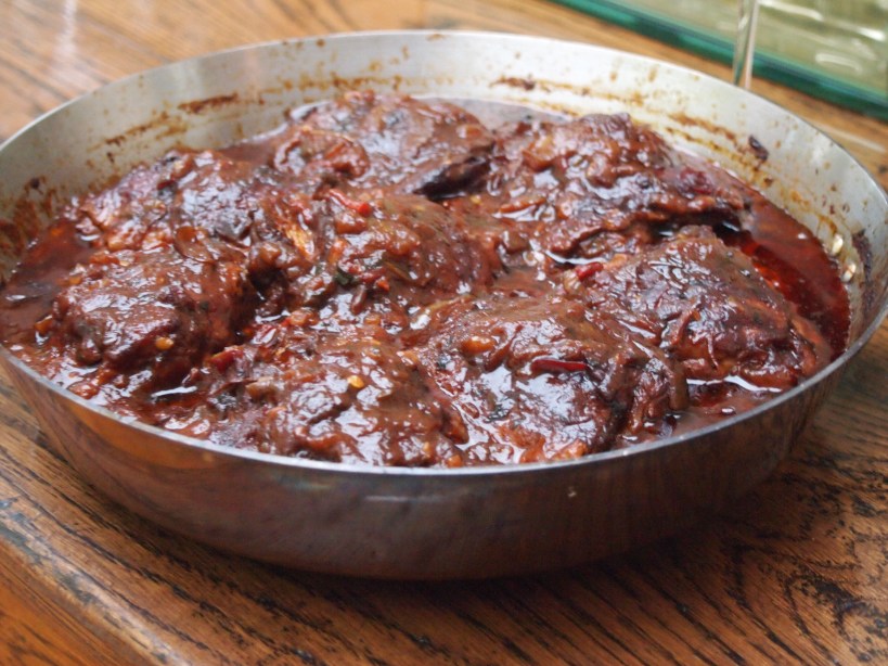 This braised chicken dish from a recent Jamie Magazine was really delicious. I was first attracted to making it by the accompanying photo but looking at the ingredient list I had my doubts as to how well it would turn out. My fears were unfounded though as it really kicked a punch flavour wise. With the obvious Middle Eastern overtones, due to the pomegranate, this would go perfectly with some rice or cous cous. The only thing to watch is that the sauce doesn’t get overly reduced as it can then veer towards being a little too tart. I cooked it for longer than the 30 minutes stipulated as I really like my chicken to be falling off the bone and managed to save it in the nick of time from being too thickened. Also don’t be put off by using the chilli even if making it for the family as it wasn’t hot at all, and I didn’t even take the seeds out.
