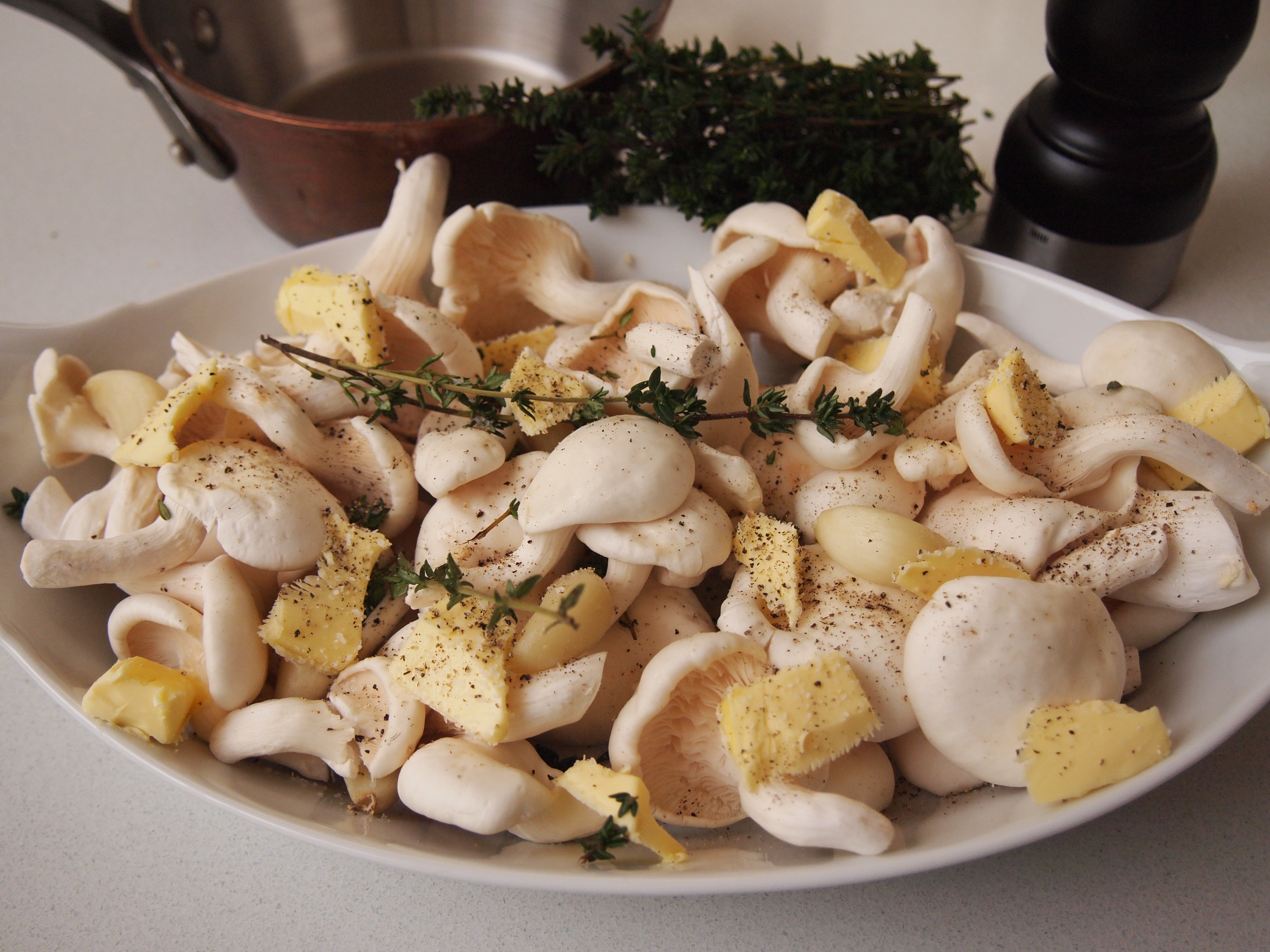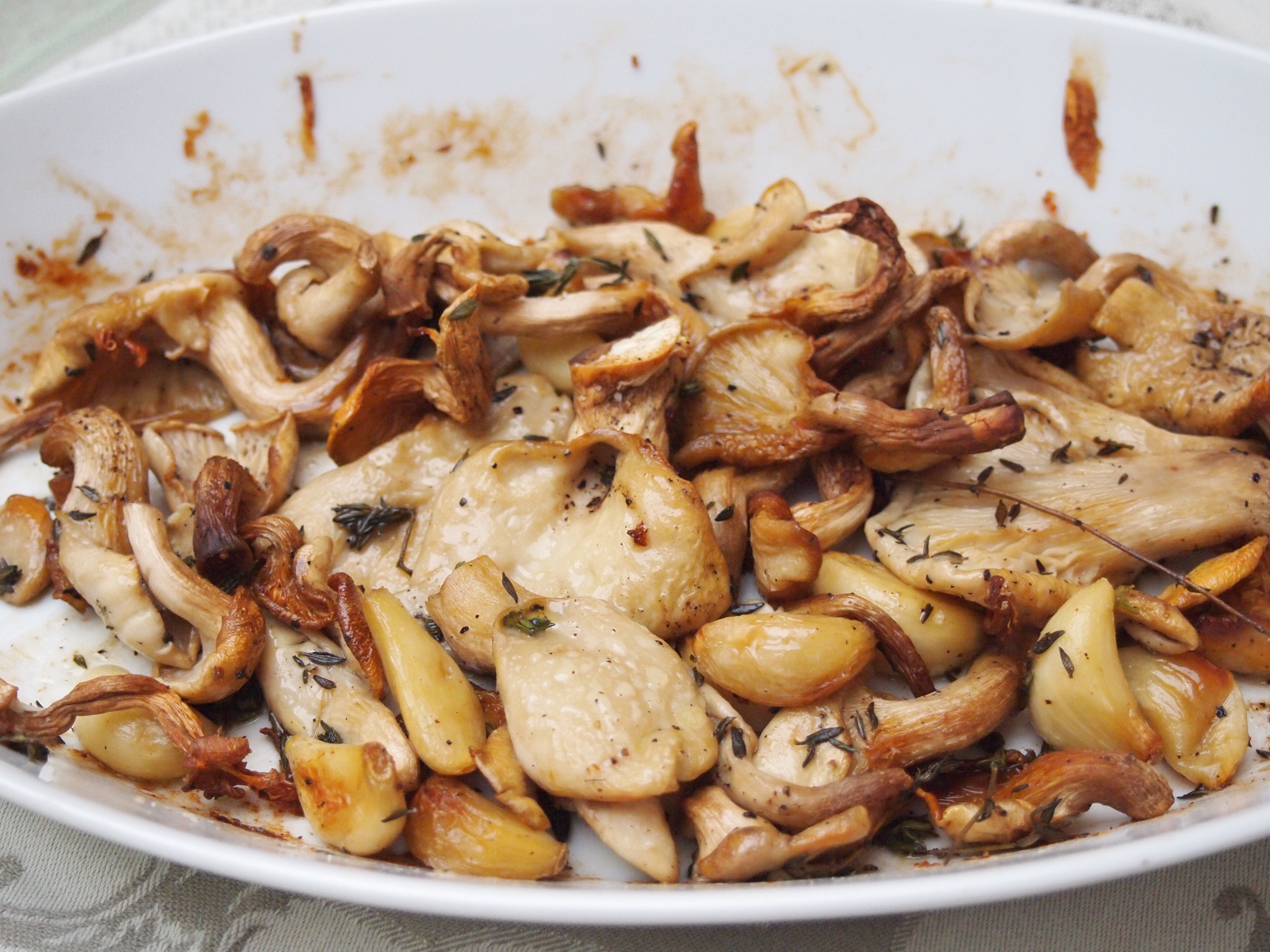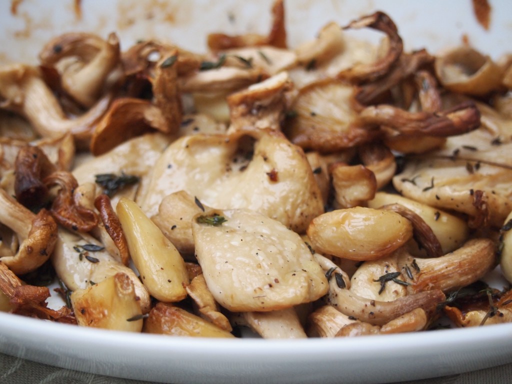 Spread the mushrooms in an oven proof dish that will hold them snuggly. Nestle the garlic cloves in and around the mushrooms. Dot with butter and sprinkle over the thyme leaves. Season with salt and pepper. Place into the oven and bake for 20 – 25 minutes until the mushrooms are golden. During the cooking time frequently baste the mushrooms with the butter in the pan to avoid them drying out.