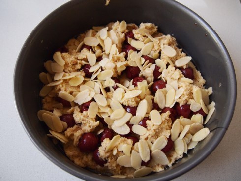 Preheat the oven to 180C. Grease a round 9 inch cake pan. Mix the cherries with the sugar and set aside. In a separate bowl combine the flour, hazelnut meal, sugar, baking powder, baking soda and salt. In a small bowl whisk together the egg, sour cream and butter. Add the wet ingredients to the dry and mix until combined. The batter will be very stiff. Put half to 3/4 of the batter in the bottom of the dish in an even layer. I found the easiest way to do this was with greased fingers. The layer will be very thin but needs to cover the entire base. Add the cherry and sugar mixture evenly over the batter and top with the remaining batter. There won’t be enough batter to cover it completely, just dob it on in places.