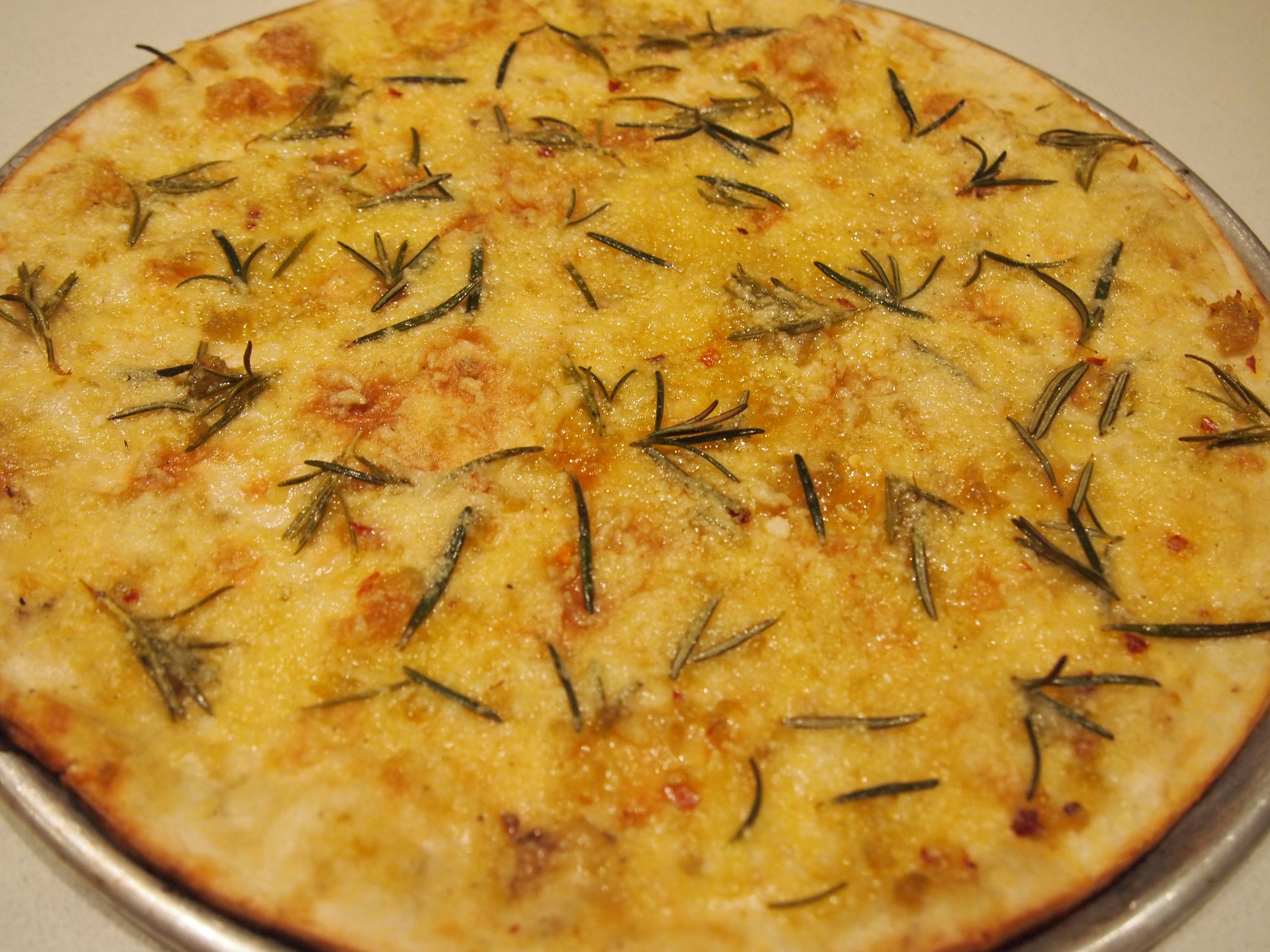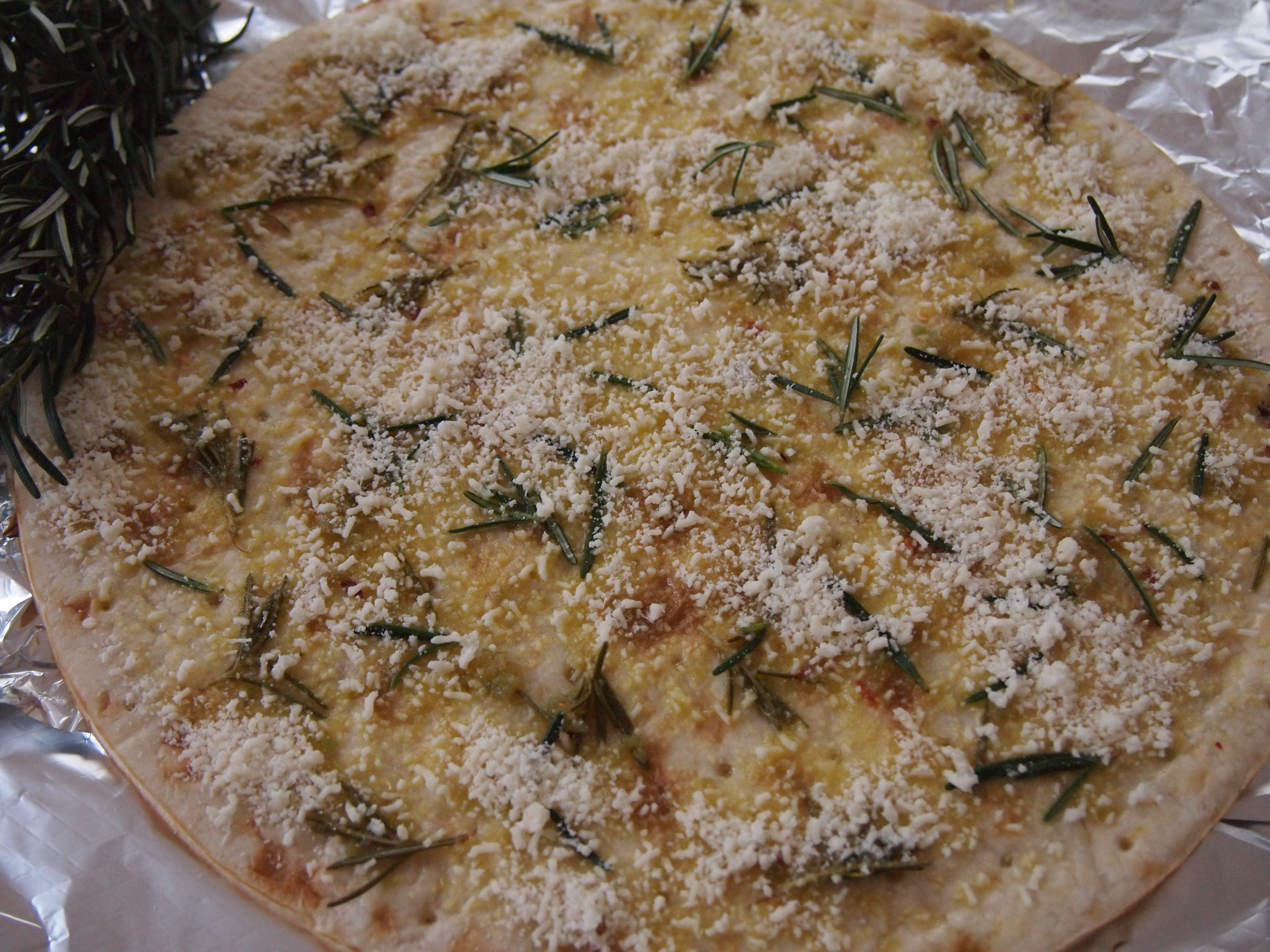 Put a small saucepan over low heat and add the olive oil, garlic, chilli, and rosemary. Gently heat the oil until it’s just warm then turn off the heat and let it sit to infuse for 10 minutes or more. Using a spoon generously cover the base of the pizza base with the oil mixture being sure to spoon on the garlic and rosemary and spread it around evenly. You may have some mixture left over and this can keep in the fridge for weeks. Sprinkle the base with some seas salt and cover with Parmesan.
