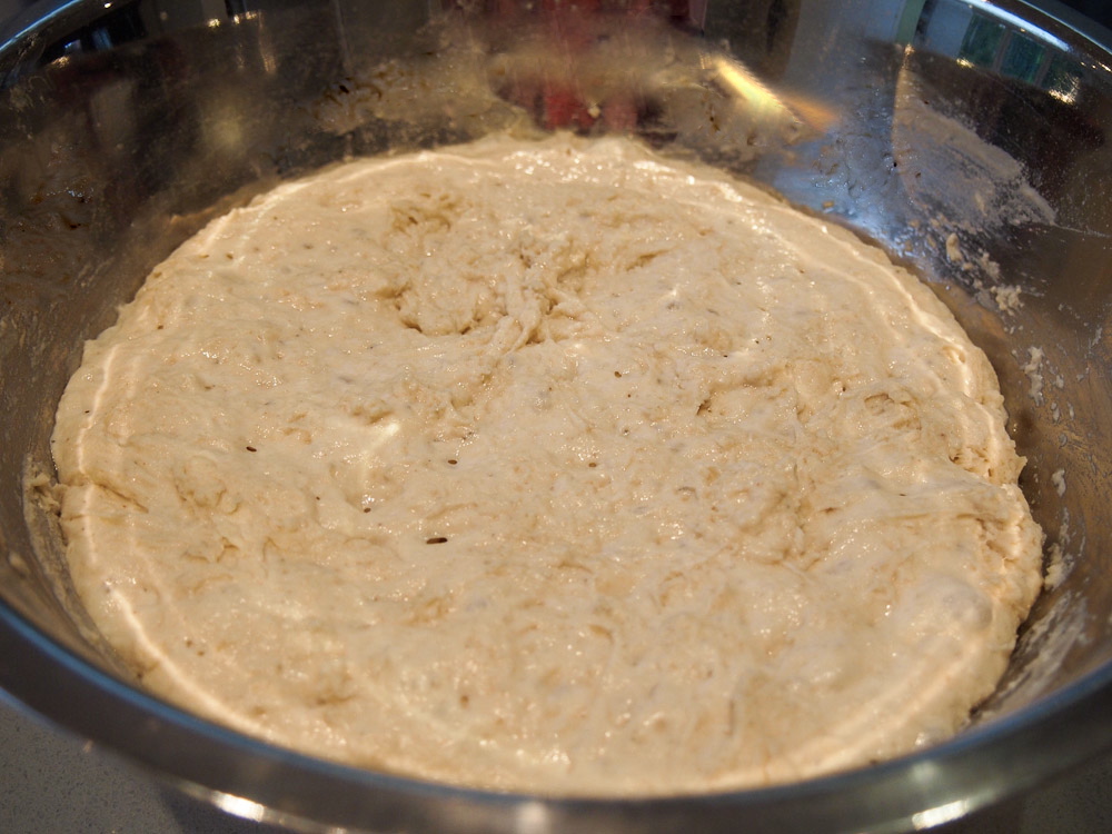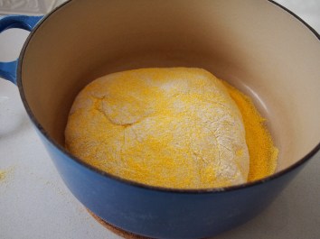 Lightly flour a work surface and place dough on it; sprinkle it with a little more flour and fold it over on itself once or twice. Cover loosely with plastic wrap and let rest about 15 minutes. Using just enough flour to keep dough from sticking to work surface or to your fingers, gently and quickly shape dough into a ball. Generously coat a cotton towel (not terry cloth) with flour, wheat bran or cornmeal; put dough seam side down on towel and dust with more flour, bran or cornmeal. Cover with another cotton towel and let rise for about 2 hours.