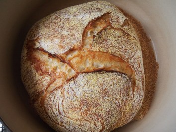 A few years ago Mark Bittman from the New York Times challenged Jim Lahey of Sullivan Street Bakery in New York to come up with a recipe for home baked bread that was as good as any artisanal loaf from a bakery. Jim met that challenge and the legend of the no knead bread was born. In fact, according to Jim this recipe is so easy that a six year old can produce bread that’s as good, if not better than any bakery in the country! This recipe has been around the blogosphere for a long time and I’ve been baking it for just about as long. The first time I made it my family didn’t believe that it was home made and thought I’d purchased it, it really is that good and more importantly, very very simple. The recipe is unique in that the water to flour quantity is very high and only a 1/4 of a teaspoon of yeast is used. The reason for this being that the dough is rested for a very long time. You need to make the dough mixture a day ahead as it needs to prove for about 18 hours. The bread is then cooked in an extremely hot oven and in an extremely hot cast iron pot with the lid on – thus replicating the heat, steam and intensity of a professional bakers oven. Ingenious! The dough for the loaf of bread above was made on a cold and windy afternoon and I don’t think I put the bowl with the dough mixture in a warm enough environment. The dough mixture after the fermentation time should have lots of little holes on the top and mine didn’t have as many as it should. So I’d recommend you make sure that this dough sits in a warm environment and if your oven has a dough proving setting then this would be good to use on a cold day.