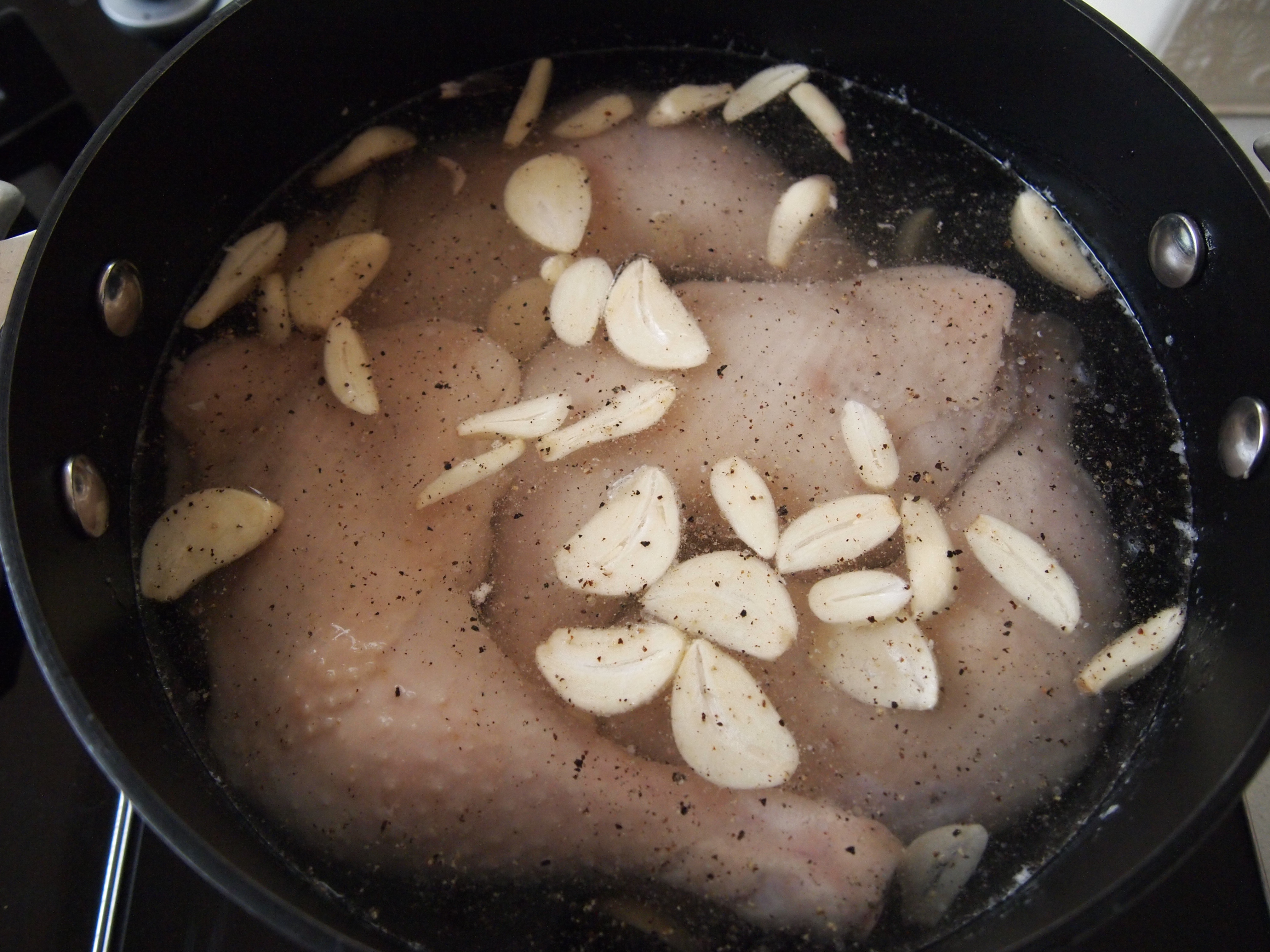 Trim the chicken pieces of all extraneous fat, take your time doing this step as you want to take off as much fat as possible but leave on the skin. Wash the chicken pieces and place them in a medium size saucepan. Cover with cold water and bring to the boil. Once boiling let it cook for a few minutes to let all the skum rise to the surface. Drain the water from the pot. Clean the pot and rinse the chicken pieces in cold water. This ensures that you end up with a very “clean” broth. Put the chicken back into the cleaned pot and add enough fresh cold water to just cover the chicken pieces, then add the garlic, salt and some freshly ground black pepper.