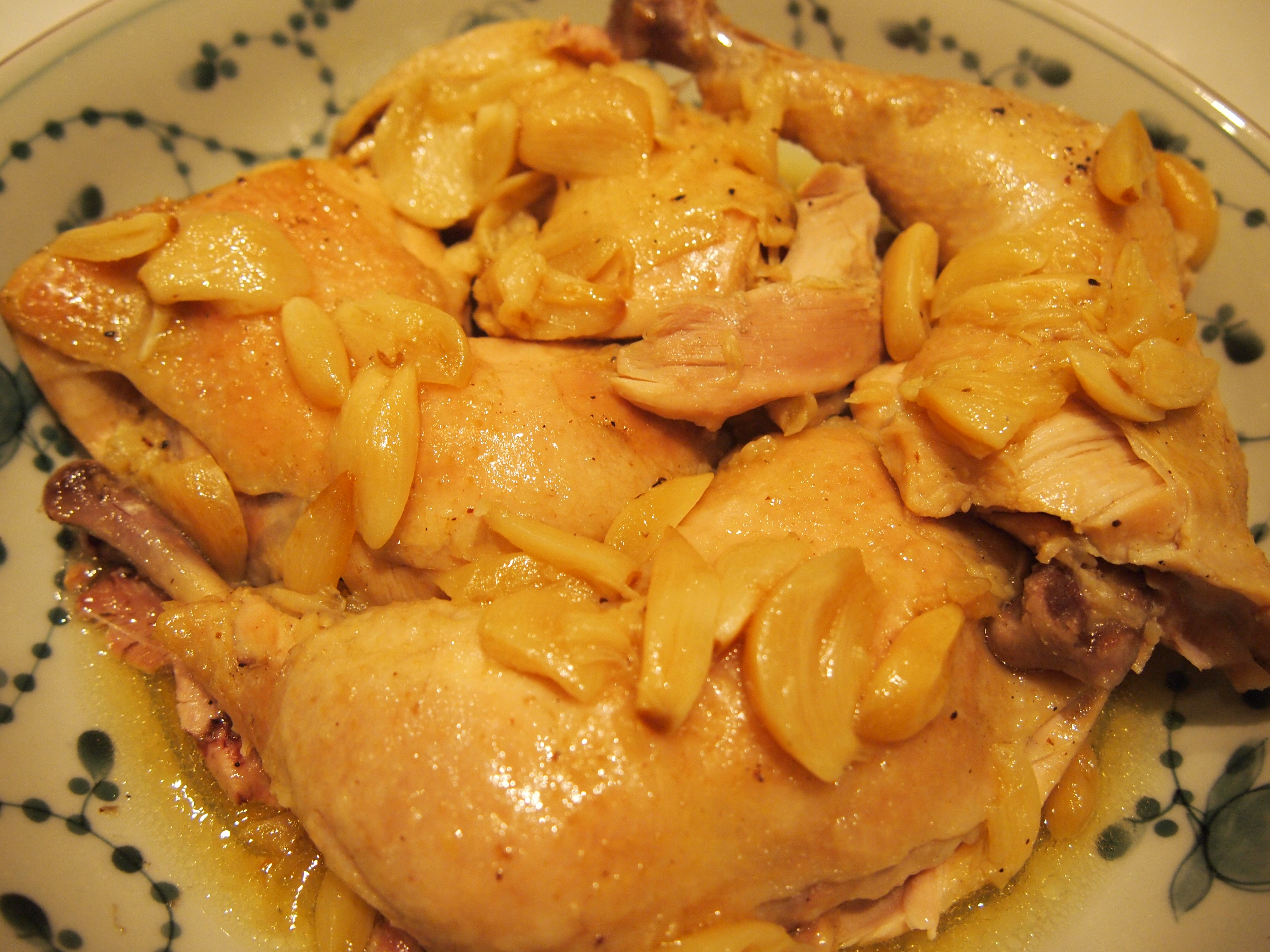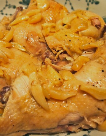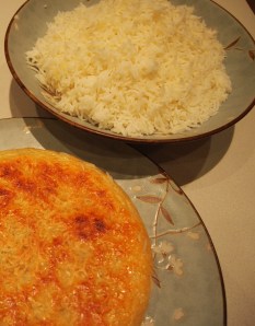 Bring to the boil again then lower the heat to a gentle steady simmer. Place the lid on the pot at a slight angle to let the steam escape and evaporate slowly. Cook the chicken for as long as it takes for the water to evaporate, leaving just 1/2 to 3/4 of a cup in the pan. The timing for this will vary depending on how low you have your heat – mine took about 4 hours. Keep your eye on it towards the end of the cooking time as the last of the liquid can evaporate very quickly. If you find that your pan has run dry add a little bit of boiling water to bottom of the pan and turn off the heat and put the lid on. Carefully transfer the chicken pieces to a platter (the chicken will be very soft and the bones are likely to pull right out) and top with the garlic pieces and juice. The chicken is best served with plain basmati rice which I made using a Persian Rice Cooker. This ingenious product cooks the rice into perfect long, separate grains and develops the beautiful crunchy rice base (tadig) which is so loved by Persians.