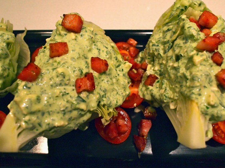 Wedge salads are a traditional steakhouse side dish and normally served with a blue cheese dressing. Whilst I’m fond of blue cheese dressing, my favourite dressing is Green Goddess. Green Goddess dressing was first created at the Palace Hotel in San Francisco in the 1920’s in honour of the hit play, the Green Goddess. The original version uses tarragon but Ina Garten revamped this classic and used basil instead, which I think is even better. I made this wedge salad using Ina’s Basil Green Goddess dressing but added some crumbled blue cheese at the end in a nod to the classic wedge. This is a fantastic barbecue side dish and the Green Goddess dressing makes the wedge salad seem a little lighter than full blue cheese version.