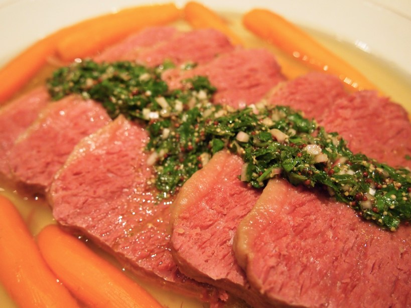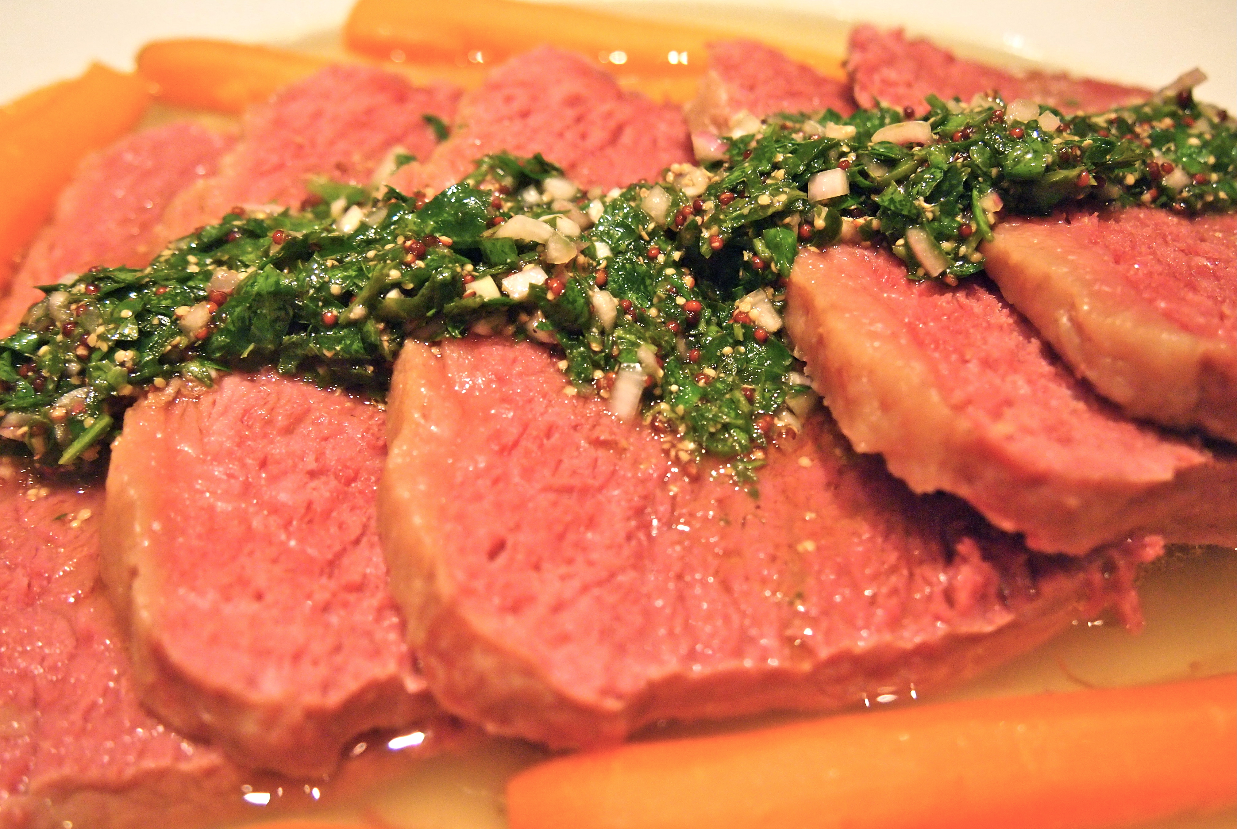 To serve carve the beef into thick slices. Ladle some of the broth onto a platter and arrange the corned beef slices on top. Arrange the carrots around the beef and top with the parsley mustard sauce.