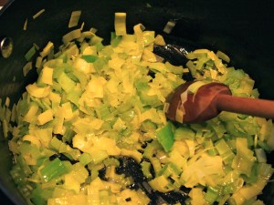 Preheat the oven to 180C. Melt the butter over medium heat in a saucepan, add the celery and leeks and cook until soft – about 4 minutes.