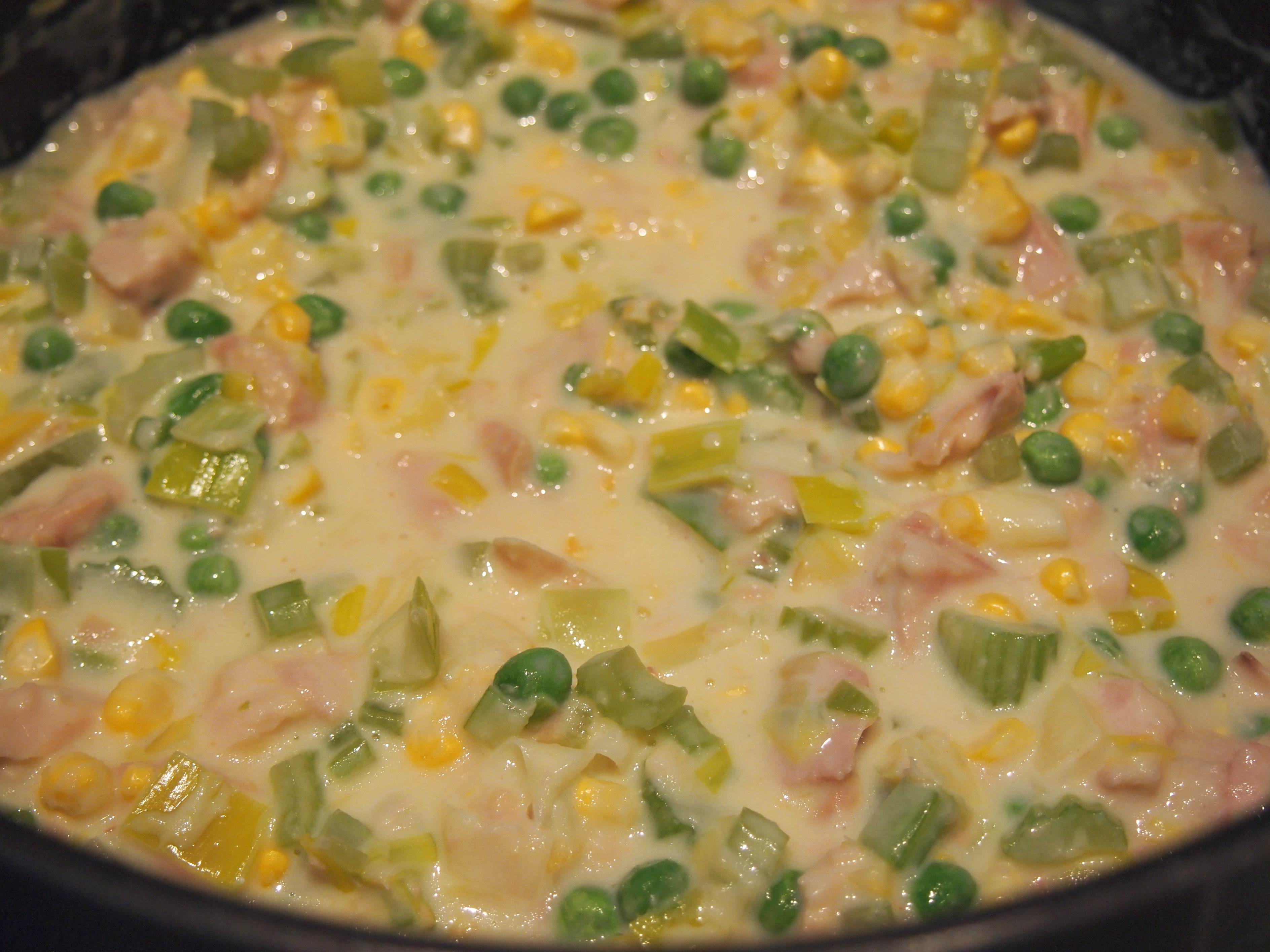 Add the flour and cook, stirring for another couple of minutes. Add the milk and keep stirring until the flour has incorporated into the milk and the mixture has thickened. Add the cheese and stir until melted through. Take off the heat and add the corn, peas and tuna.