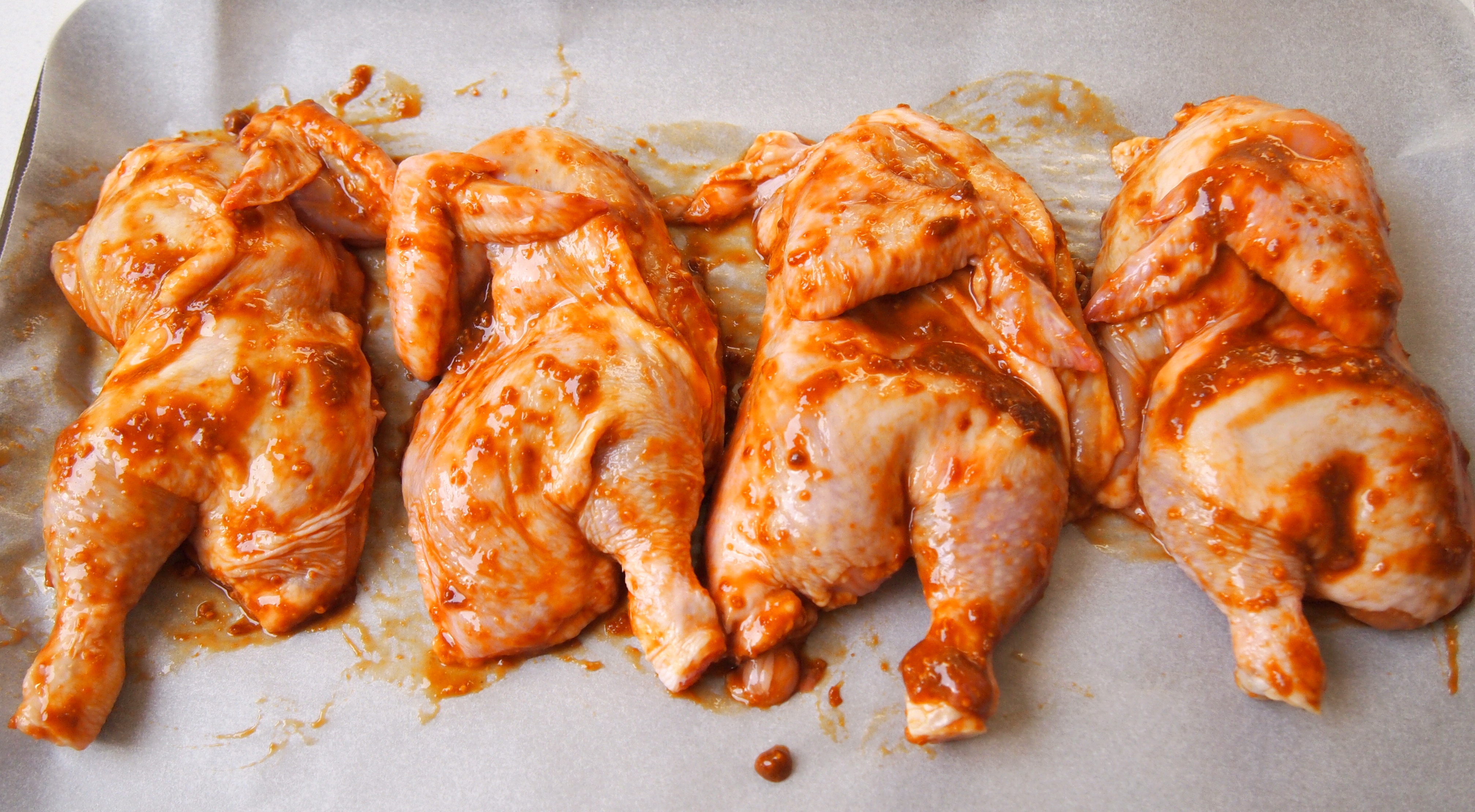 2 x 500g spatchcocks (baby chickens) trimmed and halved