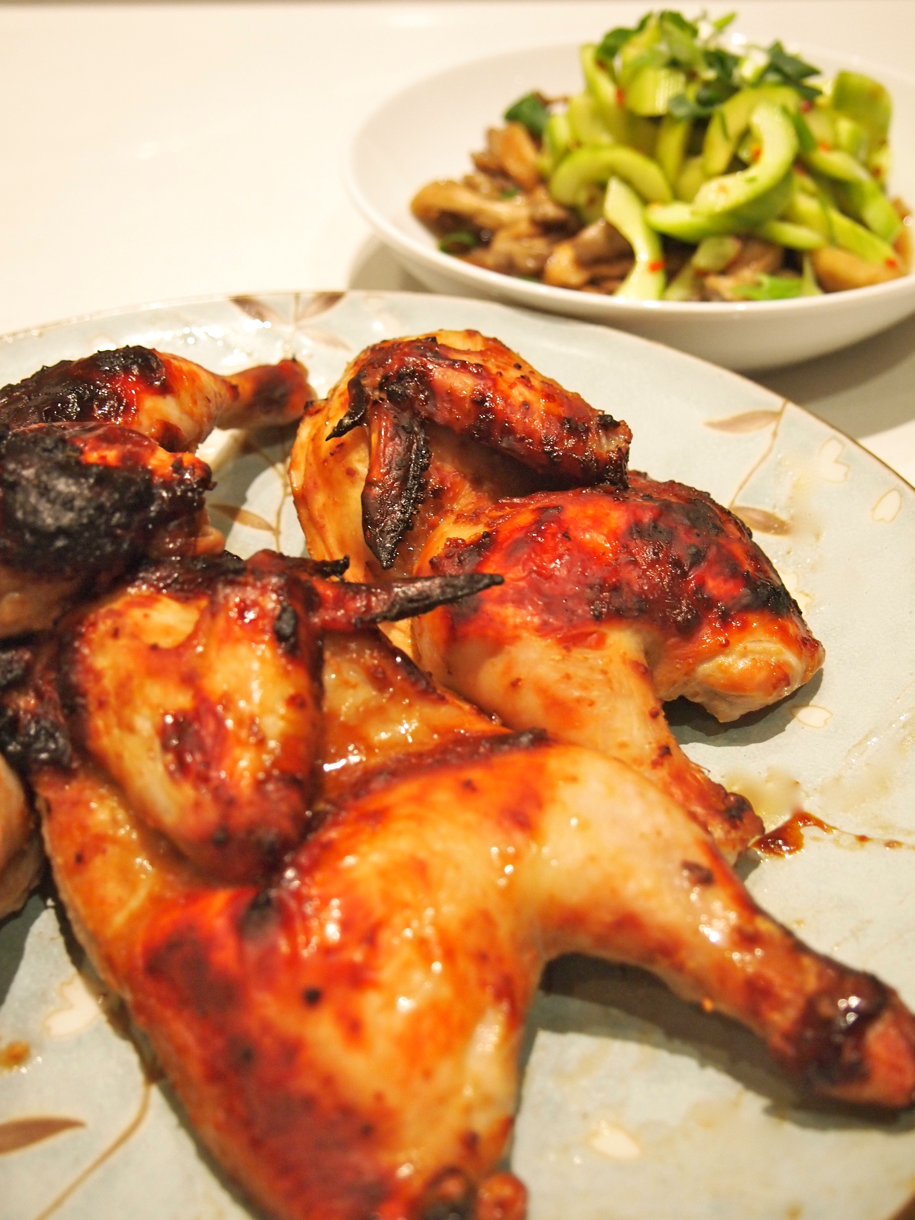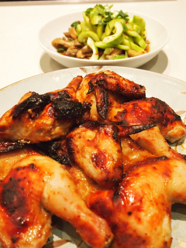 These two recipes came from a recent edition of Donna Hay Magazine. Whilst they were in the same section I’m not sure that the two dishes were meant to be served together but they were certainly a great match. Spatchcock are actually small chickens weighing roughly 500g (I believe they may be referred to as Cornish hens in the States). Given their small size I find that one spatchcock per person is usually an accurate serve. These are truly delicious and they’ll definitely be going on our regular recipe rotation. The mushrooms and cucumber may seem like and odd combination but they were amazing. The original recipe for the mushrooms included green tea soba noodles but I omitted these.