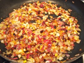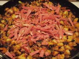 In a large skillet or frypan heat the oil and add the onions along with a pinch of salt. Cook the onions over medium heat, stirring frequently until they are golden brown. Add the potatoes and continue to fry them until they too are golden all over, adding more oil if the pan is running too dry. At the stage when the potatoes are added you don’t want to stir too often – let the potatoes colour well on one side before giving them a stir. Add the tomato paste and stir to combine it well with the onions and potatoes. Add the corned beef and cook until the beef is warmed through. Check the seasoning and add salt and pepper to taste.