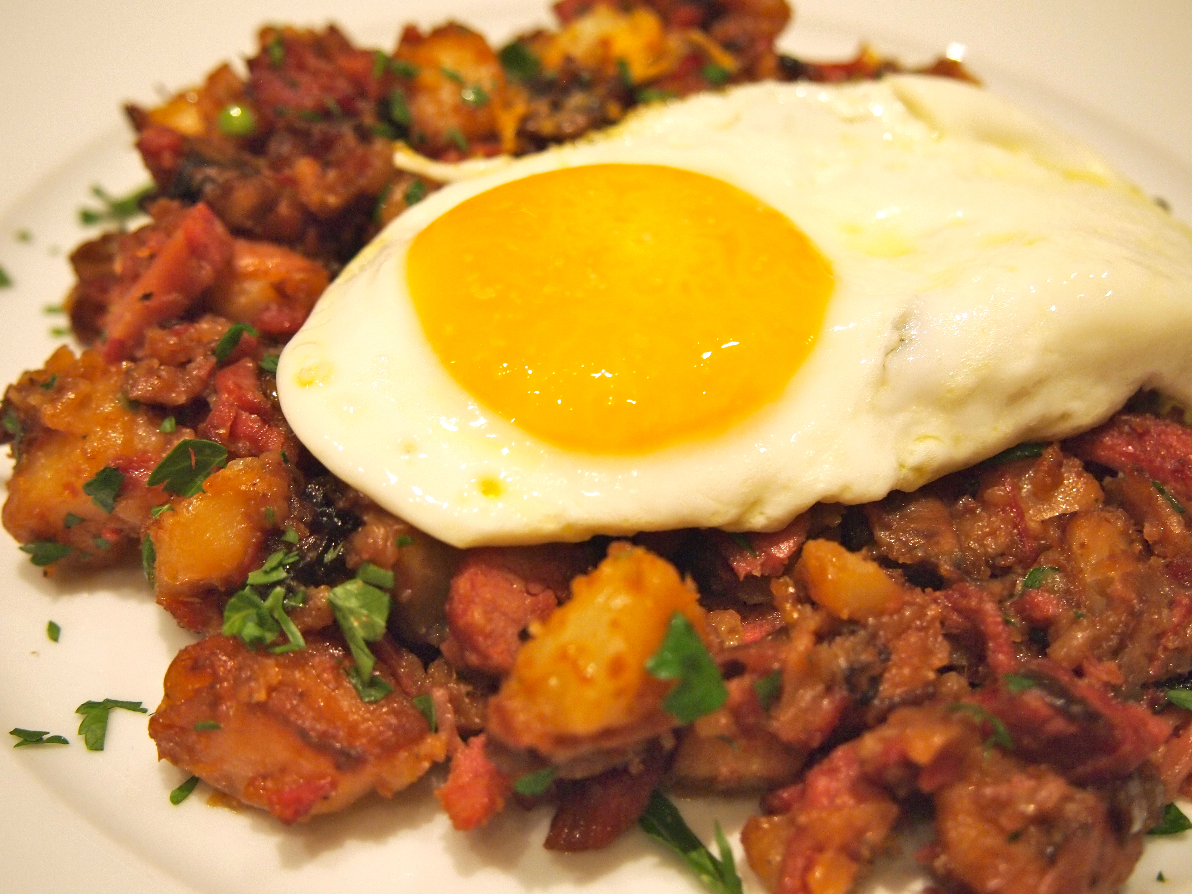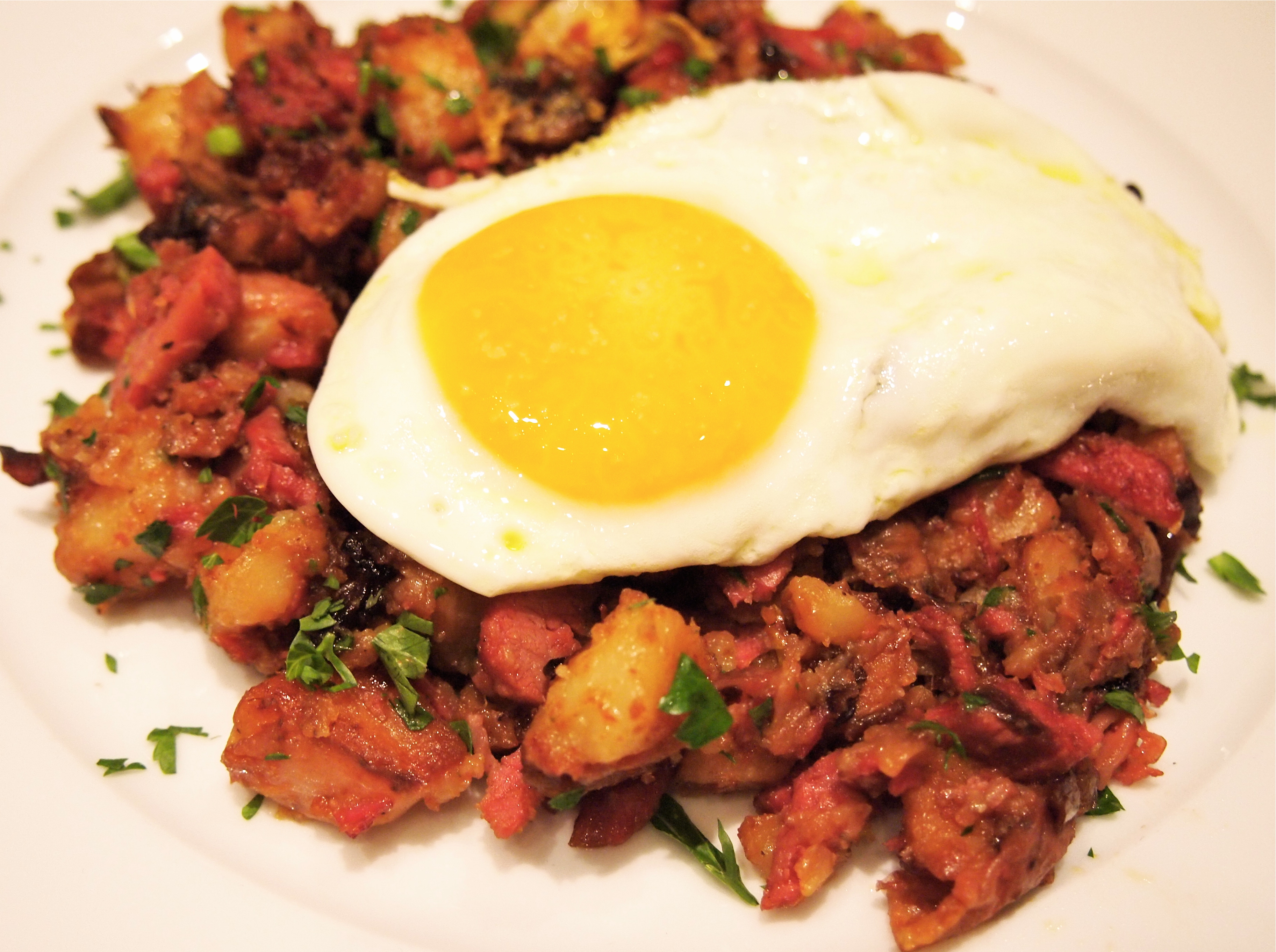 One of the best things about making corned beef is the leftovers. In fact I always try to buy a piece of beef that is bigger than what we require to ensure that there are leftovers. Our favourite ways to use the remaining meat is to make toasted Rueben sandwiches with Swiss cheese and sauerkraut or better yet corned beef hash. This is often served at breakfast or brunch but I love it for dinner. Topped with a fried sunny-side up egg it feels like indulgent nursery food. The key to making this super tasty is to take the time to really slowly caramelise the onions and the potatoes.