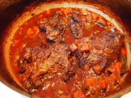 Preheat oven to 160C. Heat oil in a large flameproof casserole over medium high heat. Cook the beef in batches, turning until browned. Remove from the pan and set aside. Add onion, carrot and celery and cook, stirring for 8 minutes, until softened and starting to brown. Add anchovies, tomato paste, salt and garlic and cook for another couple of minutes. Add bay leaves and wine and bring to a simmer. Return beef to pan with stock and worcestershire sauce. Bring back to a simmer, then cover and transfer to the oven. Bake for 3 hours or until beef is tender.. Allow beef to cool in stock. Once cooled remove beef from stock, and shred with a fork, then combine with 1 cup of the strained cooking liquid, taste and adjust seasoning, if required. Set aside and keep warm. The beef at this point can be refrigerated for a day or two and reheated in a saucepan on the day required.