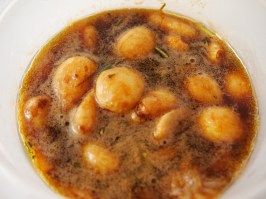 To make the garlic put the cloves into a small saucepan and cover with plenty of cold water. Bring the water to the boil and boil for 10 minutes uncovered. Drain the garlic and dry the saucepan. Add the garlic back into the pan with the olive oil and fry for a few minutes over medium heat until garlic is starting to brown. Add the water and balsamic and bring to the boil then simmer uncovered for 10 minutes. Add the salt, rosemary and sugar and simmer for a further 10 minutes. Put aside.