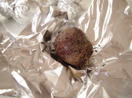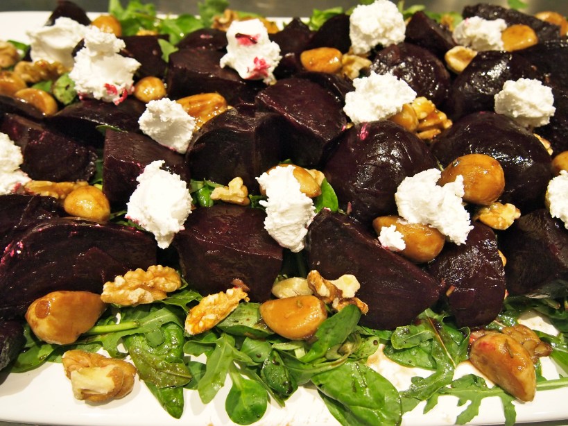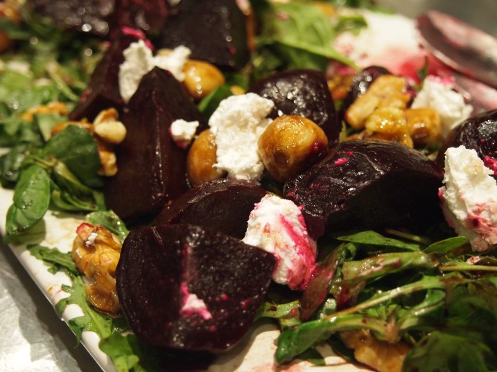 It’s taken me a while to become fond of beetroot, maybe it was all the canned pickled beetroot that adorned Australian hamburgers growing up. But now I love them and the added bonus is that they’re incredibly good for you. I find the easiest way of cooking beetroot is to wrap them individually in foil and cook them in the oven for about an hour until tender and then slip the skins off. They retain all their flavour and there’s very little mess in peeling them. This is a bit of a composed salad in that all the ingredients are cooked separately and then assembled neatly at the end. Apart from the roast beetroot and goats cheese there’s also rocket, walnuts and caramelised garlic. I was unsure about the addition of the garlic and my family members were too; some loving them and others not keen on them with the beetroot. I thought they worked quite well and made for a more interesting flavour profile.