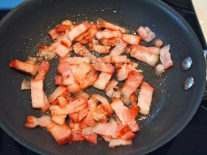 Heat a teaspoon of olive oil in a small frypan and cook the pancetta or speck for a few minutes until the fat has rendered a little and starting to crisp. Set aside.