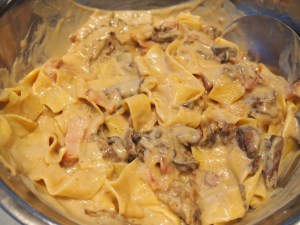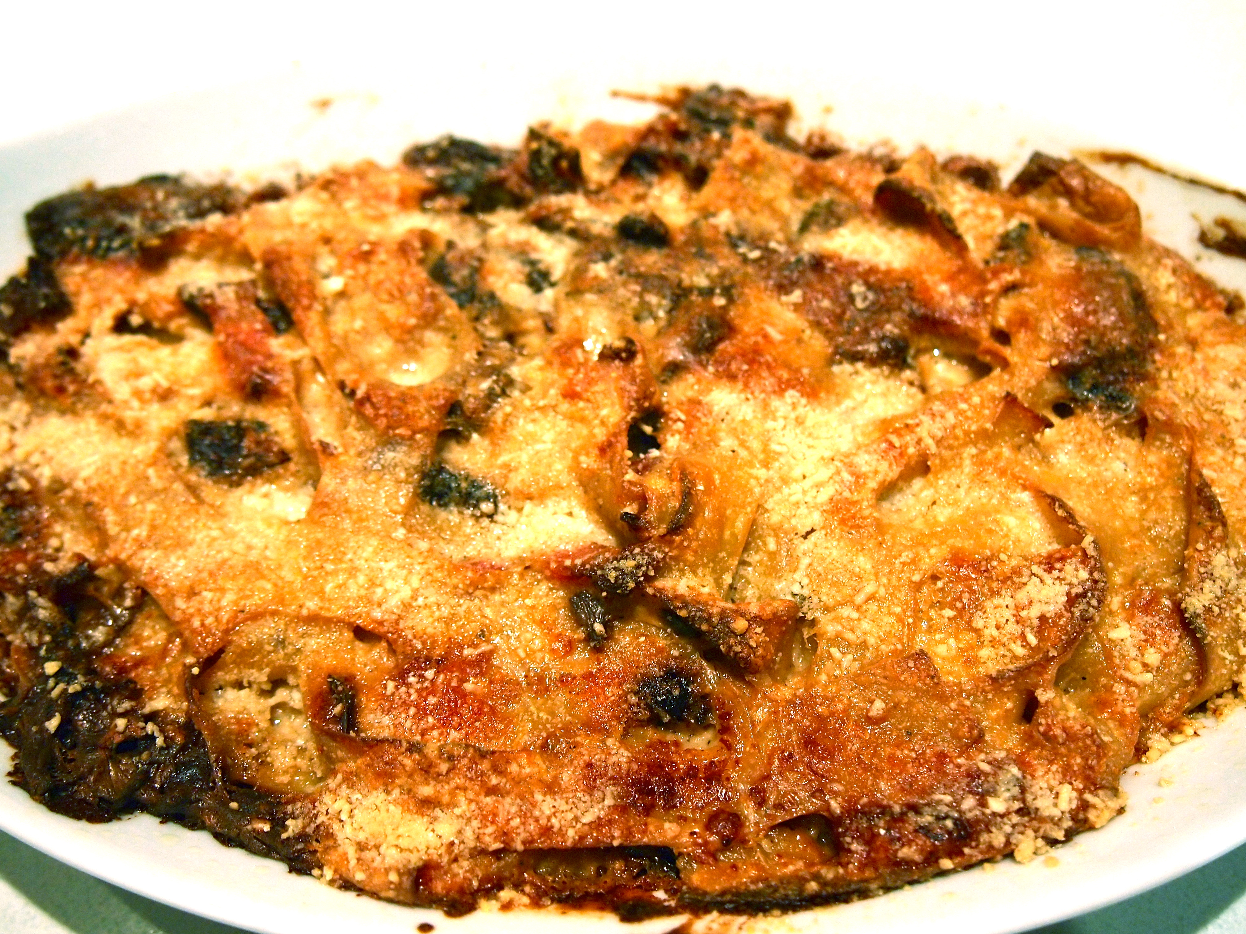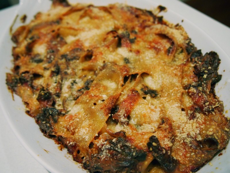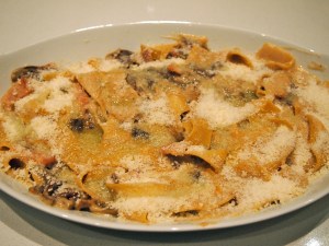 This would have to be one of the best baked pasta dishes I’ve ever made, or tasted, for that matter and I don’t say that lightly. It comes from one of my favourite chefs, Simon Hopkinson. The recipe below will feed 2-3 people and I think it tastes best when made to these quantities. The pasta needs to lie in a shallow gratin dish so if you need to increase the amounts listed don’t be tempted to put it into a deeper dish; just use a larger shallow dish or divide it into two dishes. I wasn’t able to find any good quality pancetta; I find most of the Australian made pancetta (Italian pancetta is still not allowed to be imported into Australia) to be overly salty and I wasn’t near a good deli to pick up a better quality artisan one so I used speck instead and I must say that I found the smokey flavour worked very well with the porcini. Next time I’ll make it with pancetta as originally intended and believe me, there will be a next time!