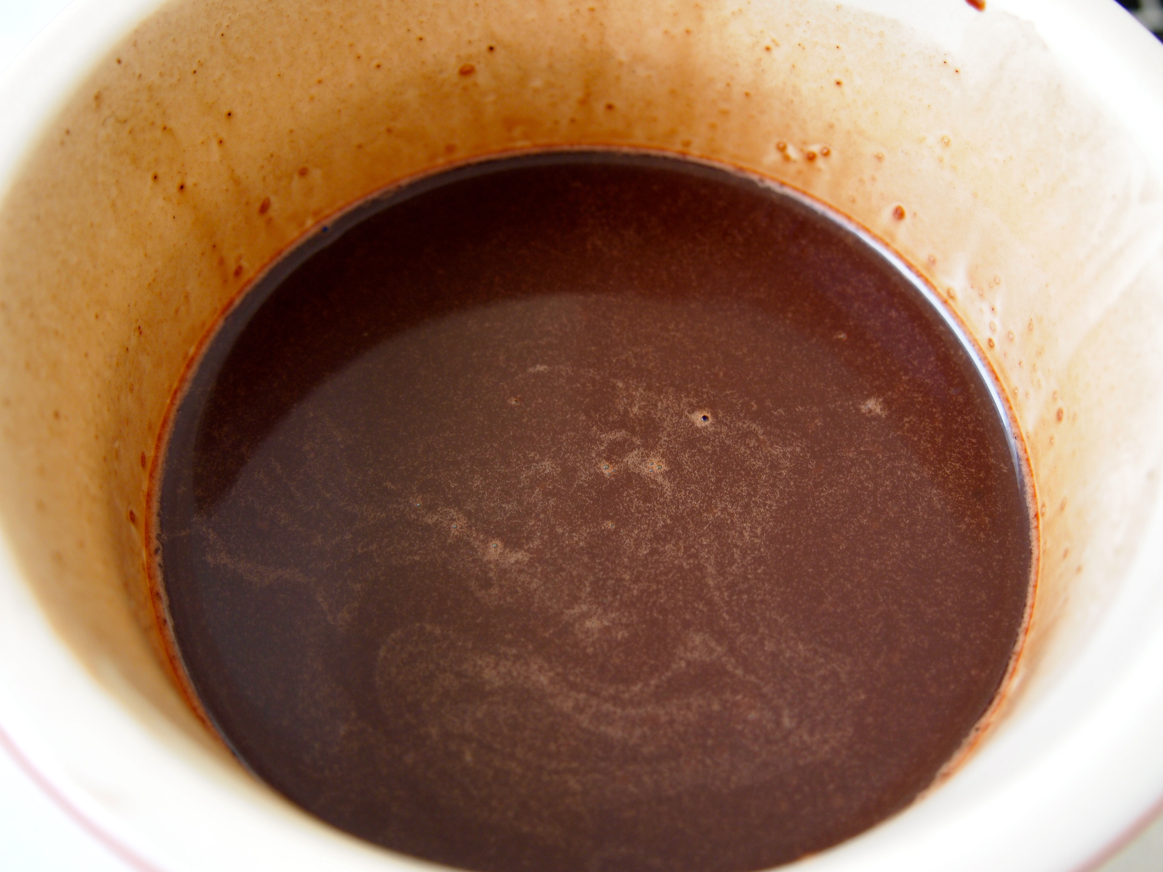 In a large saucepan, whisk together 1 1/2 cups (375 ml) of the water with the sugar, cocoa powder, and salt. Bring to a boil whisking frequently. Let it boil, continuing to whisk for 45 seconds.