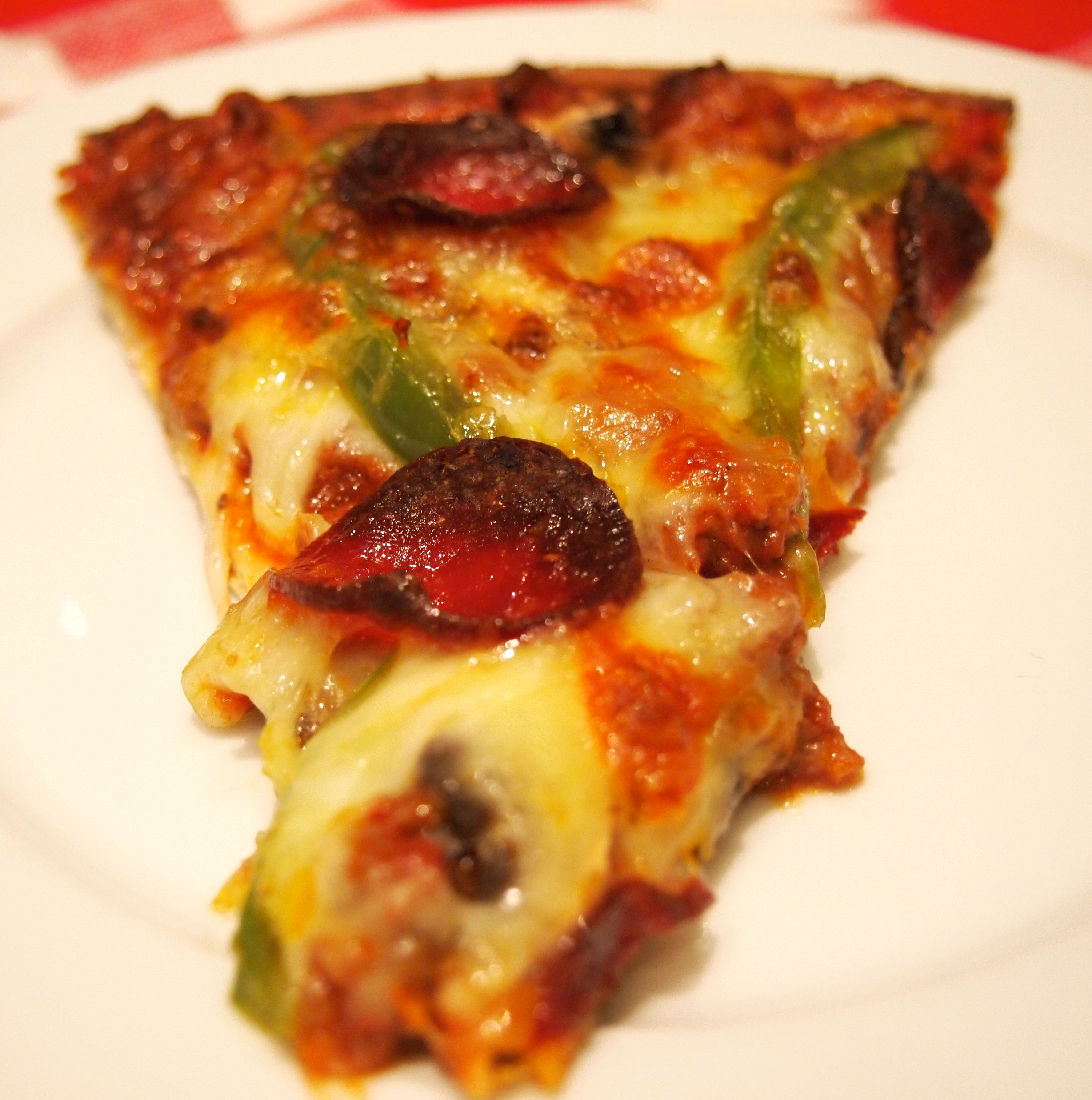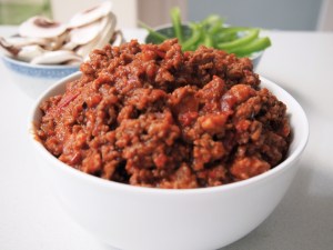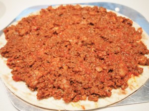 Those pizza aficionados out there who import mineral water from Naples to make their pizza dough, look away now. This is as far away from an Italian style pizza as you can get – think more a piece of pie from Brooklyn, and it’s delicious. No scant toppings of wafer thin prosciutto and arugula here. This pizza is hearty. Don’t get me wrong, I’m very partial to a thin based pizza with minimal toppings of buffalo mozzarella and heirloom tomatoes but every now and then it’s nice to have something a little more gutsy. The name meat fest is due to the fact that the base of the pizza isn’t topped with the usual tomato sauce but a rich smoky bolognese style ragu made with minced beef and crumbled sausages; and if that wasn’t enough meat the pizza is then garnished with final layer of pepperoni. If I have the time and inclination I often make my own pizza dough (minus the imported mineral water) but I’ve recently found a store bought pizza base (Bazaar brand) that’s thin and can stand up to the toppings while remaining crisp which means I can decide to have pizza without too much planning ahead. If the weather’s good we grill this on the barbecue which gives it a wonderful wood oven flavour but it’s still awesome baked in a hot oven.