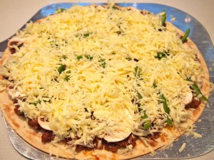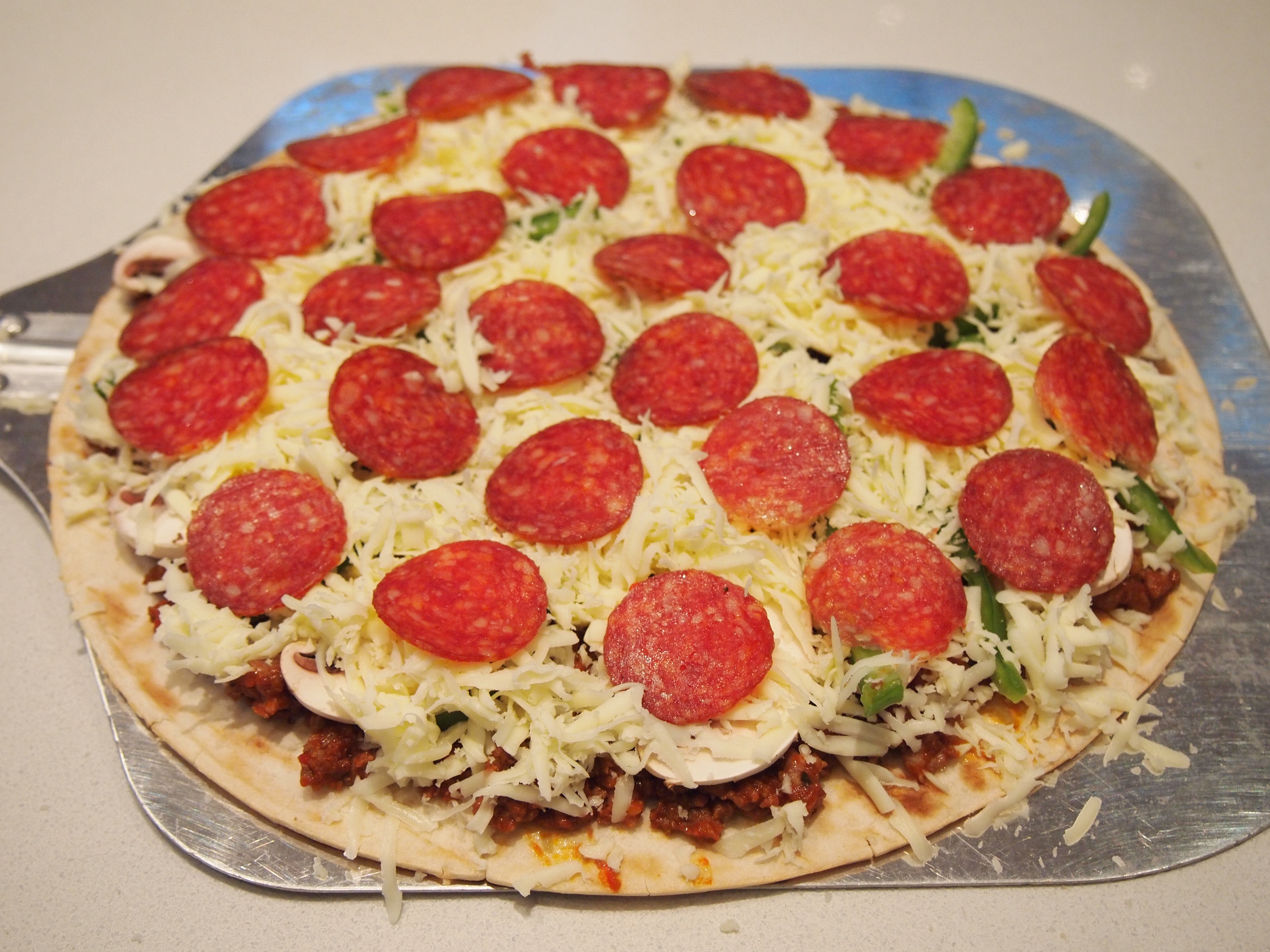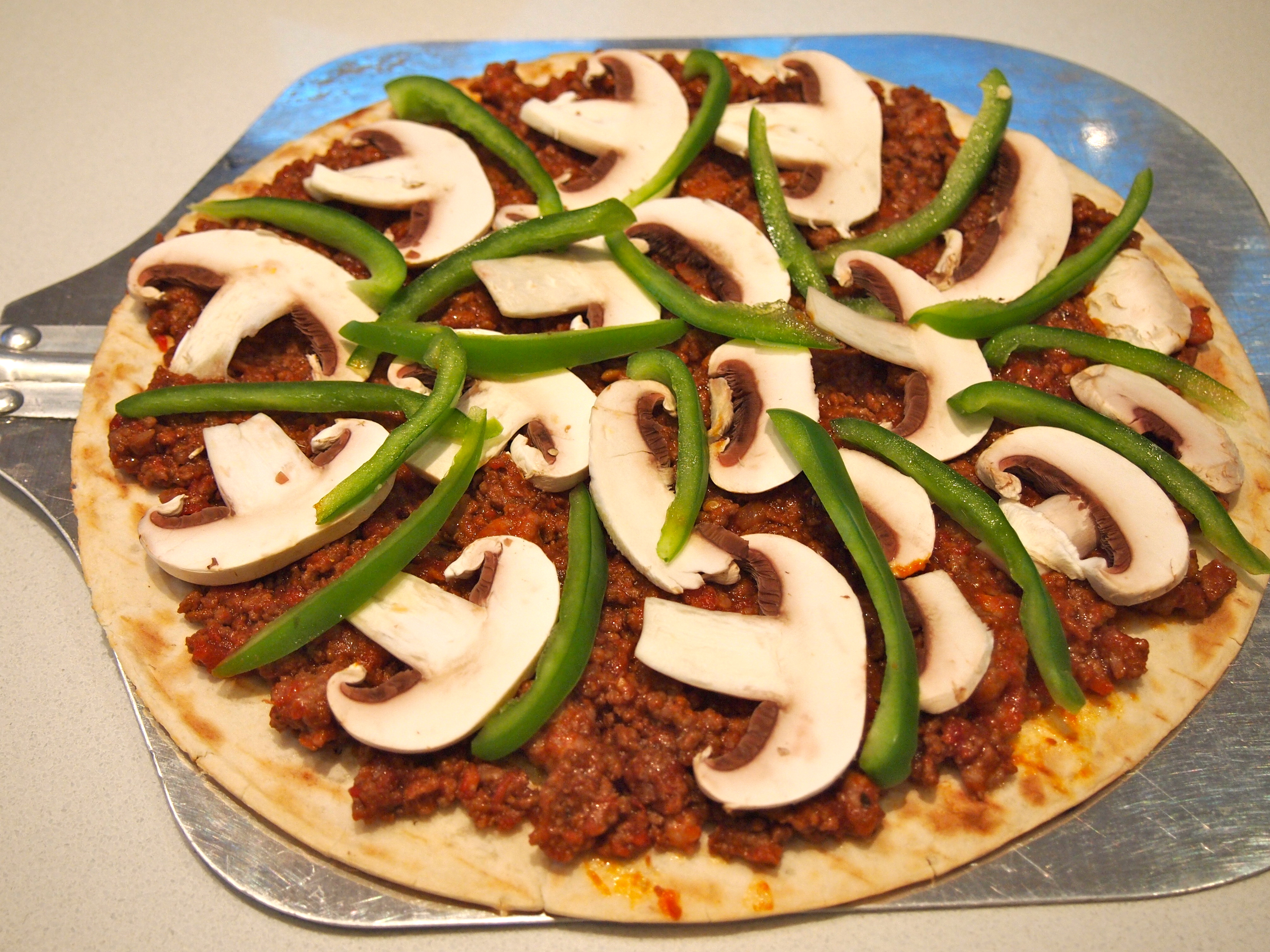 Preheat oven to 220C (or if you ant to make it on the barbecue set up your grill for indirect heat). Take the pizza base and top it with enough ragu to give a nice thick even layer over the entire base, leaving a small border around the edge. Add a layer of the sliced mushrooms followed by a layer of the sliced green pepper. Add the mozzarella evenly over the pizza then add a final layer of pepperoni.