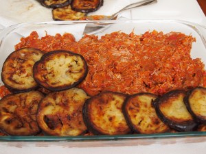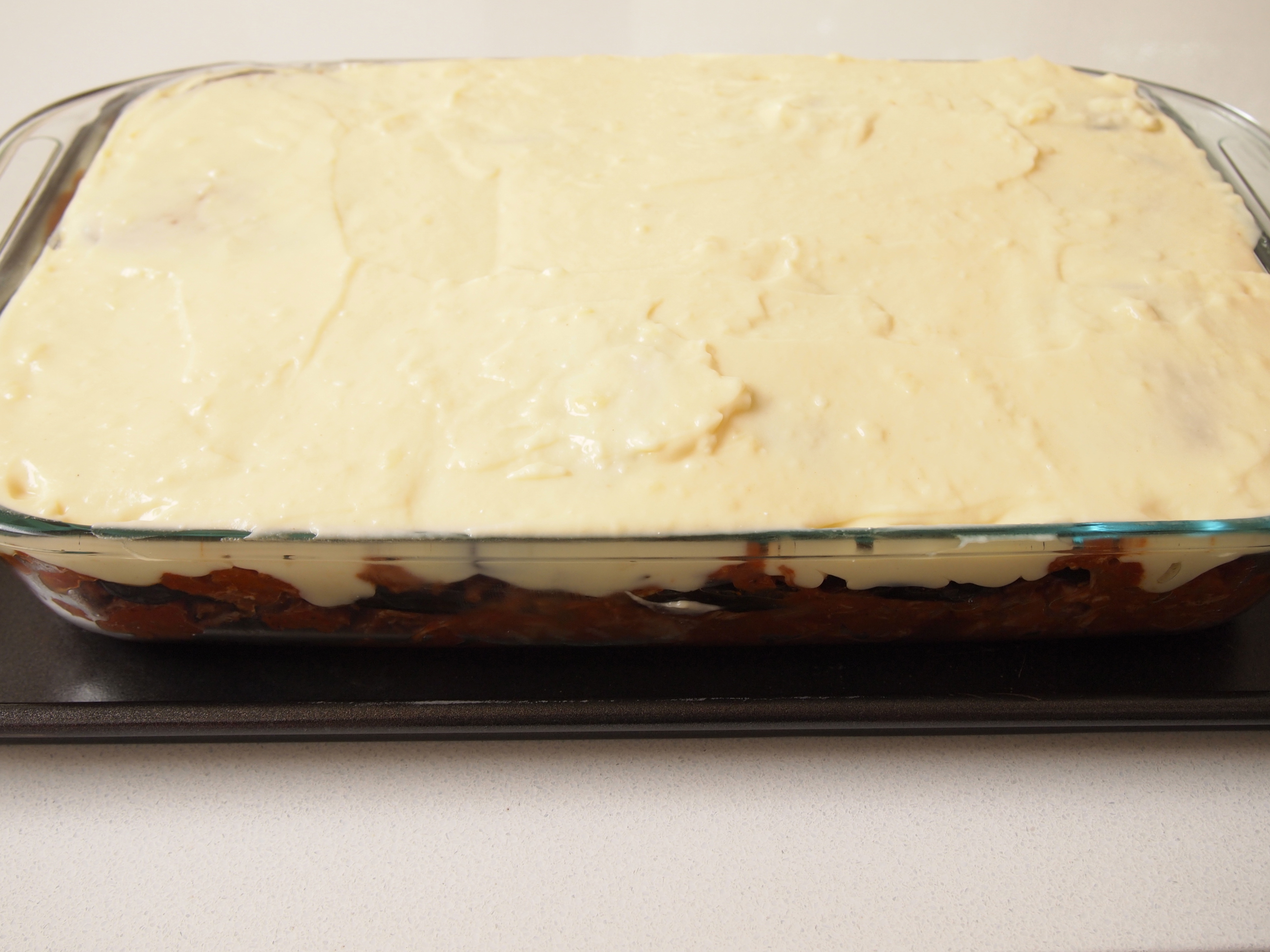 In a large oven proof baking dish, I used a lasagne dish, Place one third of the eggplant over the base in a single layer. Top with half the lamb. Add half the reminding eggplant, then the remaining lamb. Top with remaining eggplant and spread over béchamel. bake moussaka for 30 minutes or until the top is golden brown.