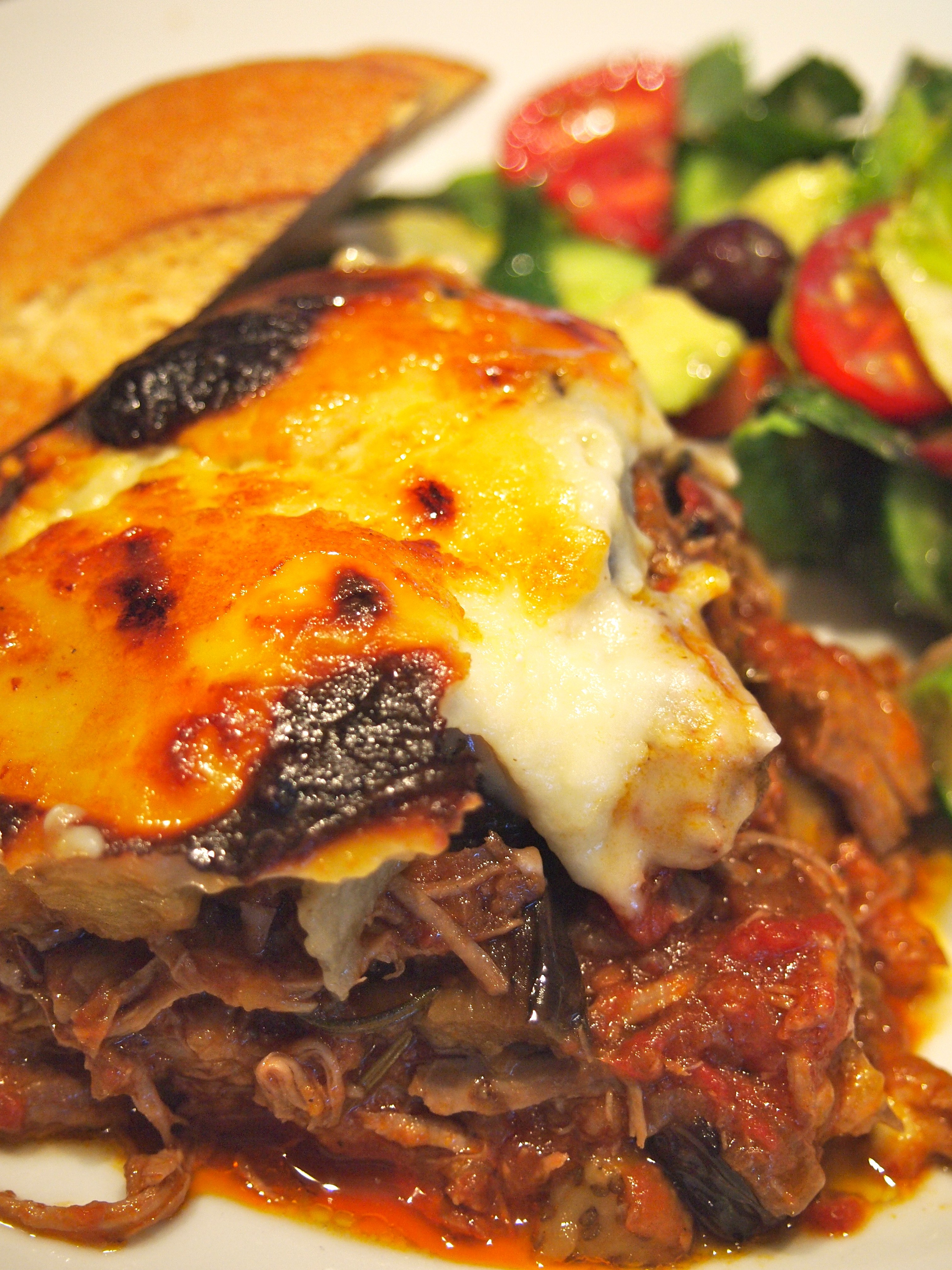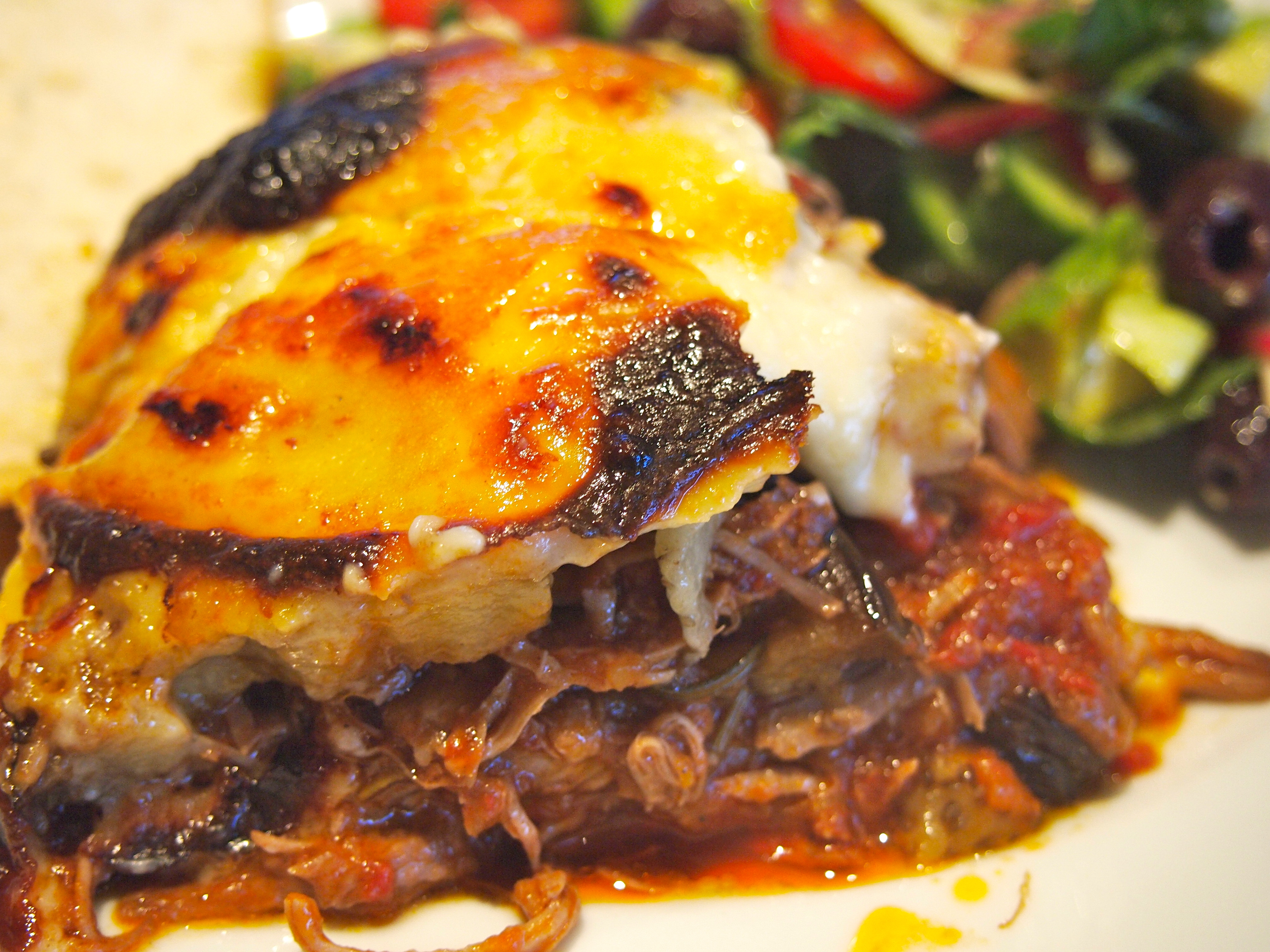 Moussaka is sometimes referred to as the Greek version of lasagne, with fried eggplant slices replacing the pasta. It’s similar to lasagne in that there’s a ragu of minced meat which is topped with a béchamel sauce before being baked but it has a very different flavour profile due to the ragu being made with minced lamb and spiked with cinnamon and allspice. This version is slightly different again as the minced lamb is replaced with shredded lamb shoulder. It’s a delicious alternative and one that my family preferred to minced lamb. The other similarity to lasagne is that both dishes are a labour of love. It’s time consuming to make and not something you can throw together after work but perfect for a rainy Sunday when you feel like some time in the kitchen. I tackle these sort of dishes by preparing it over a number of days. Making the ragu one day, then frying the eggplants the next day and finally making the béchamel and assembling and baking on the third day. Moussaka is quite rich and the quantities below fed four of us twice and it was even better reheated the second time. I served it with a greek salad full of olives and feta with a lemon and oregano dressing.