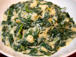 To make the creamed spinach heat the olive oil in a large skillet or frypan over medium heat. Add the washed and drained spinach along with a large pinch of salt and cook, stirring frequently until the spinach has completely wilted. Remove from the pan and put into a colander over a bowl to drain of excess liquid. In the same pan add the butter and when melted add the onion, garlic and another pinch of salt and cook until the onions are very soft, make sure the heat isn’t too high as you don’t want to colour the onions or the garlic. Add the flour and cook for a couple of minutes stirring the flour into the onion and butter mixture. Using a whisk add the milk and cook whisking until the milk has incorporated into the sauce and has thickened. Reduce the heat to very low, add the nutmeg and season with salt and pepper. Add the spinach back to the pan, squeezing it beforehand to make sure there is no excess liquid and stir into the sauce until well combined and the spinach has heated through.