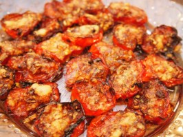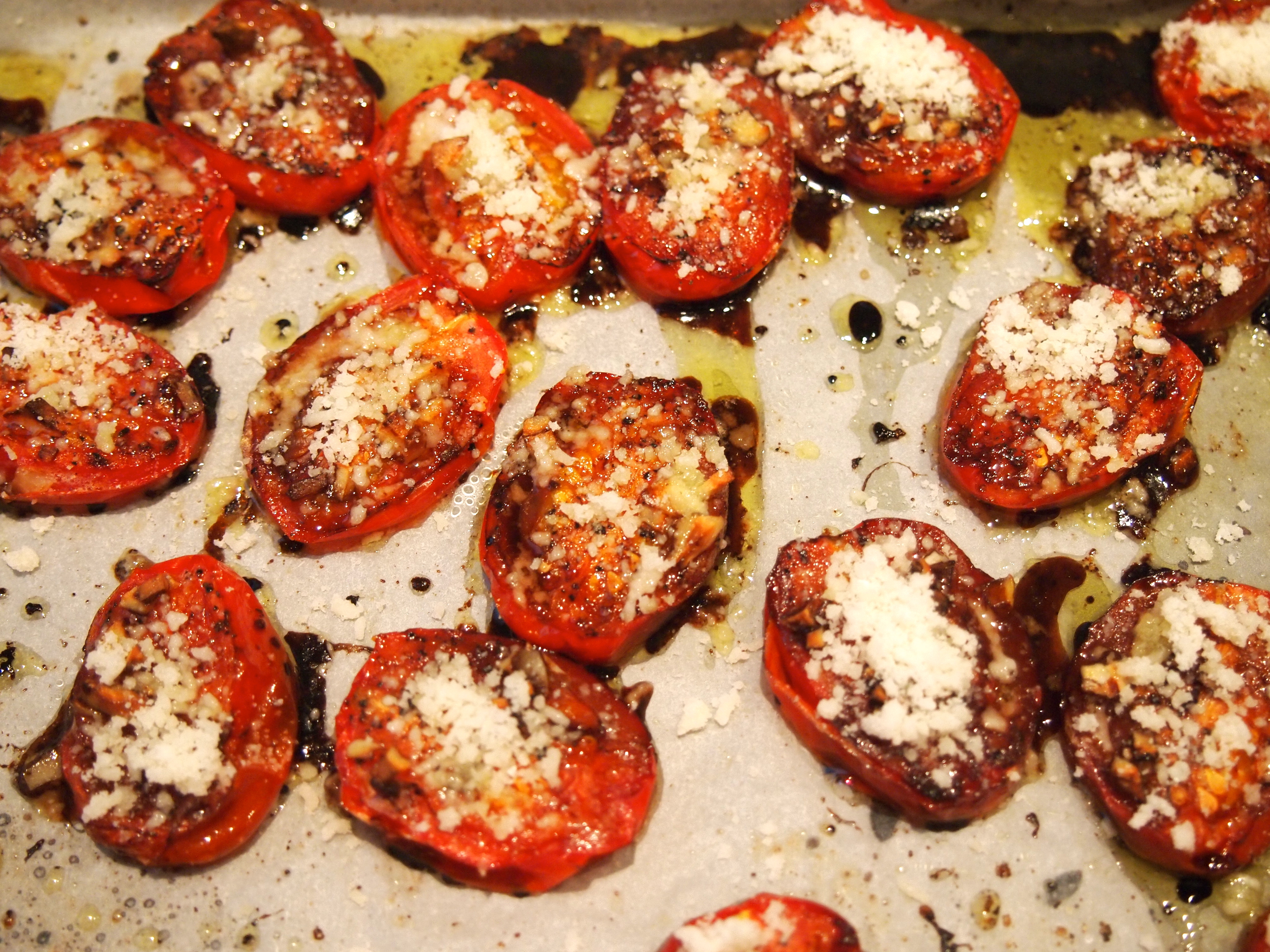 To make the roast parmesan tomatoes preheat oven to 180C. Wash and halve the tomatoes and place on a shallow baking sheet lined with baking paper. Sprinkle with salt and pepper and drizzle on a little olive oil followed by a little balsamic vinegar over each tomato half. Place some of the garlic on each tomato and sprinkle with the sugar. Place in the oven for 20 minutes or until the tomatoes have roasted and starting to turn a little brown on the edges. Remove from the oven and sprinkle with parmesan cheese and roast for a further 10 minutes.
