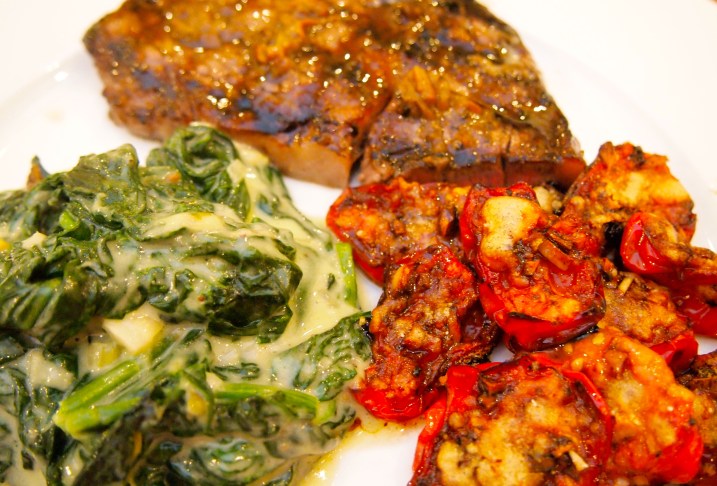 You may have noticed from the posts here that we’re partial to our steaks. We normally barbecue a steak at least once a week and the only problem that poses is what to serve with it. It’s hard trying to come up with different side dishes, especially if you take potatoes out of the equation which is what we’ve been trying to do. Here are a couple of side dishes that always please – creamed spinach and roast tomatoes. Creamed spinach is a steakhouse favourite and I cook it in a couple of different ways. When I’m short of time I just cook the spinach with some garlic, drain it of excess water , add a little nutmeg and cream and blend it with a stick blender. It’s delicious but not the traditional way of making creamed spinach. The recipe below is the more classic method and it’s very good. The other side dish that goes great with grilled meats is roast tomatoes. Steakhouses normally serve some sort of tomato side dish, usually a tomato salad with a steak sauce dressing but I find roasting the tomatoes with a little balsamic and garlic and then finishing off with a little parmesan gives then incredible flavour, even if your tomatoes weren’t that great to start off with. So next time you’re in a quandary as to what to serve with your steaks go the steakhouse route – they’re classics for a reason!