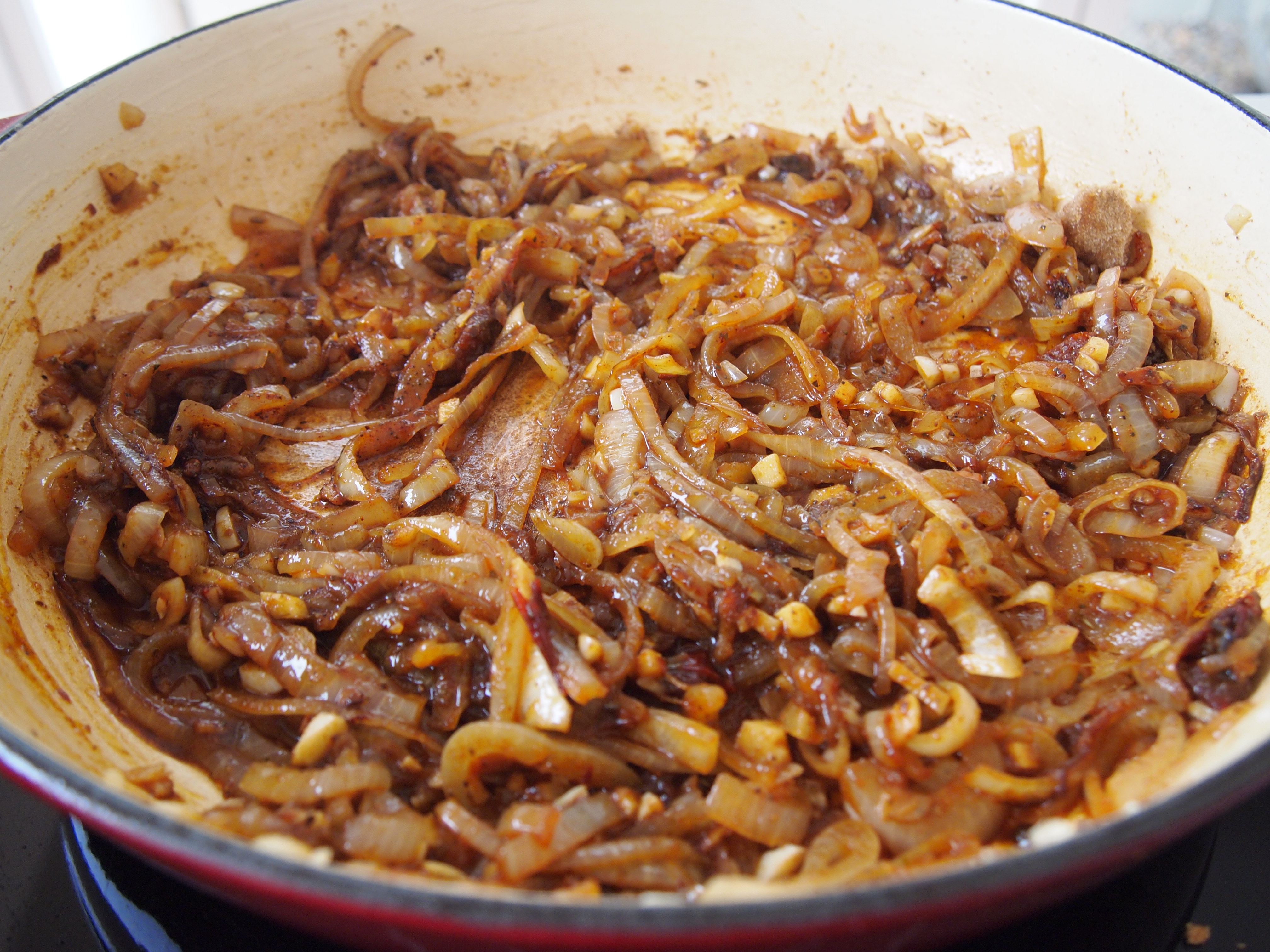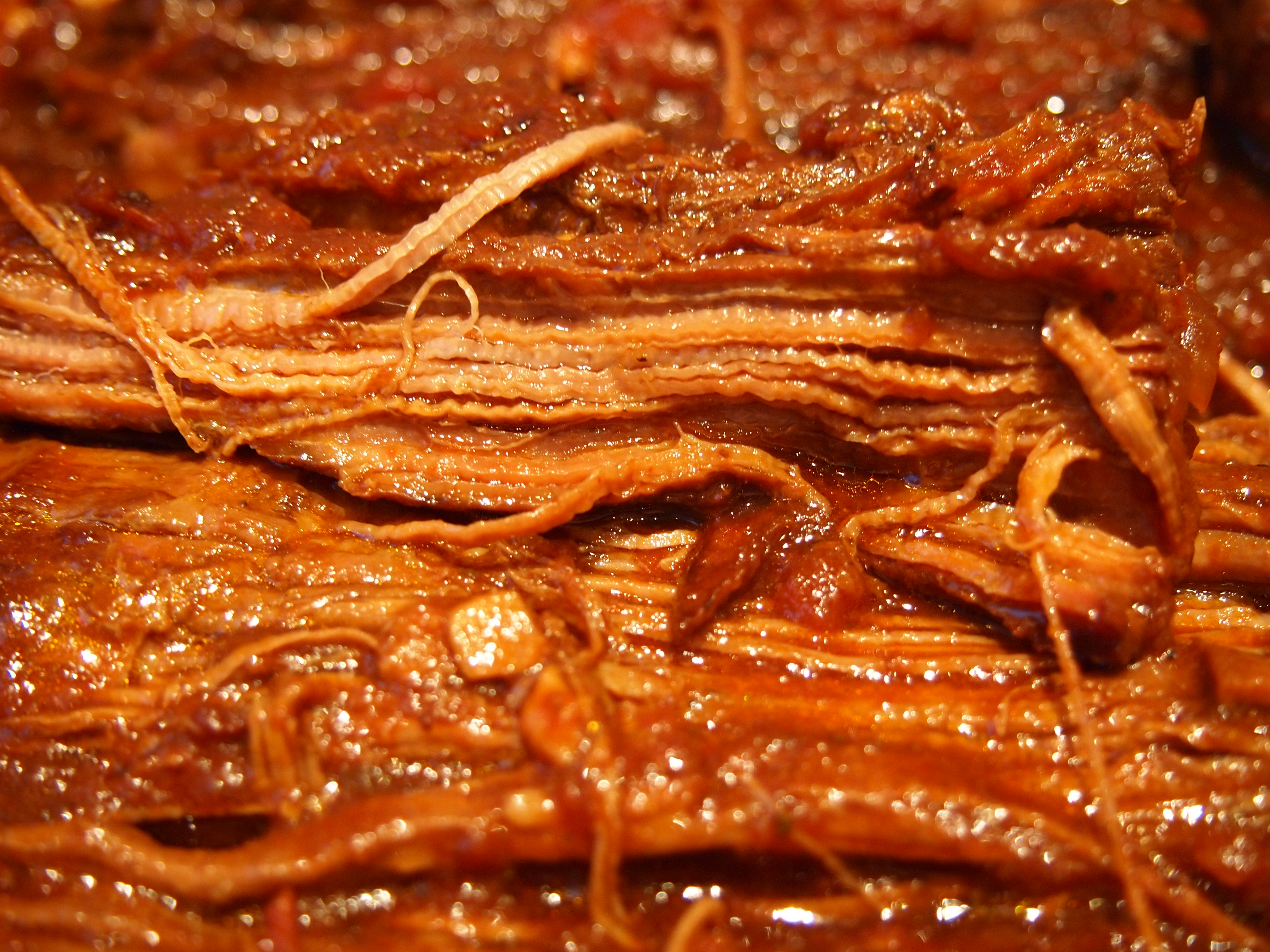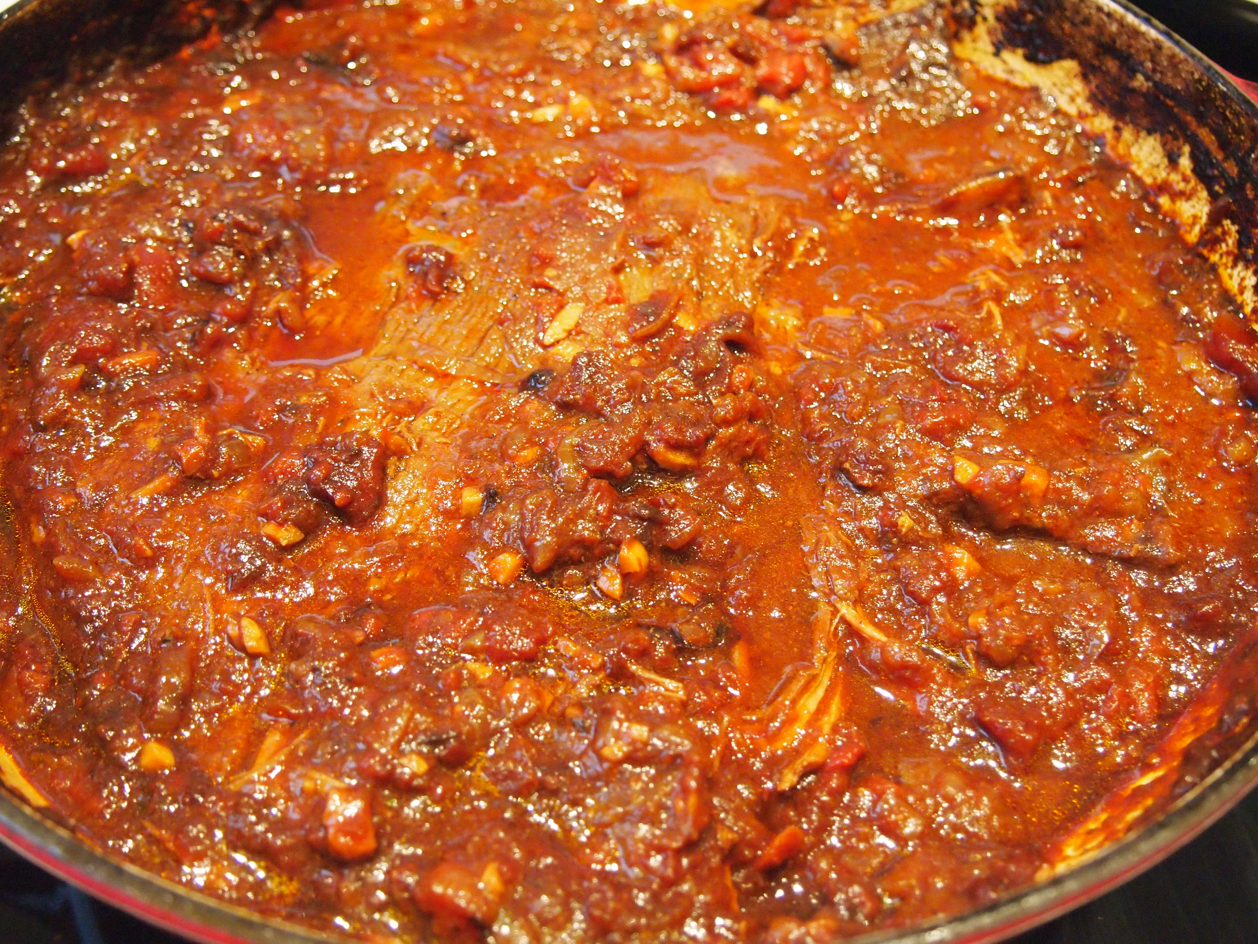 Return the brisket to the pan and nestle it in the sauce. There should be enough liquid to just cover the meat. Bring to the boil, put on the lid and transfer to the oven for 3-4 hours or until the meat is fork tender. Check the meat and sauce every now and then to make sure that the liquid isn’t reducing too much. When the brisket is cooked remove the meat from the sauce and slice or shred it on a board and return it to the pan to smother it in the sauce until ready to serve.