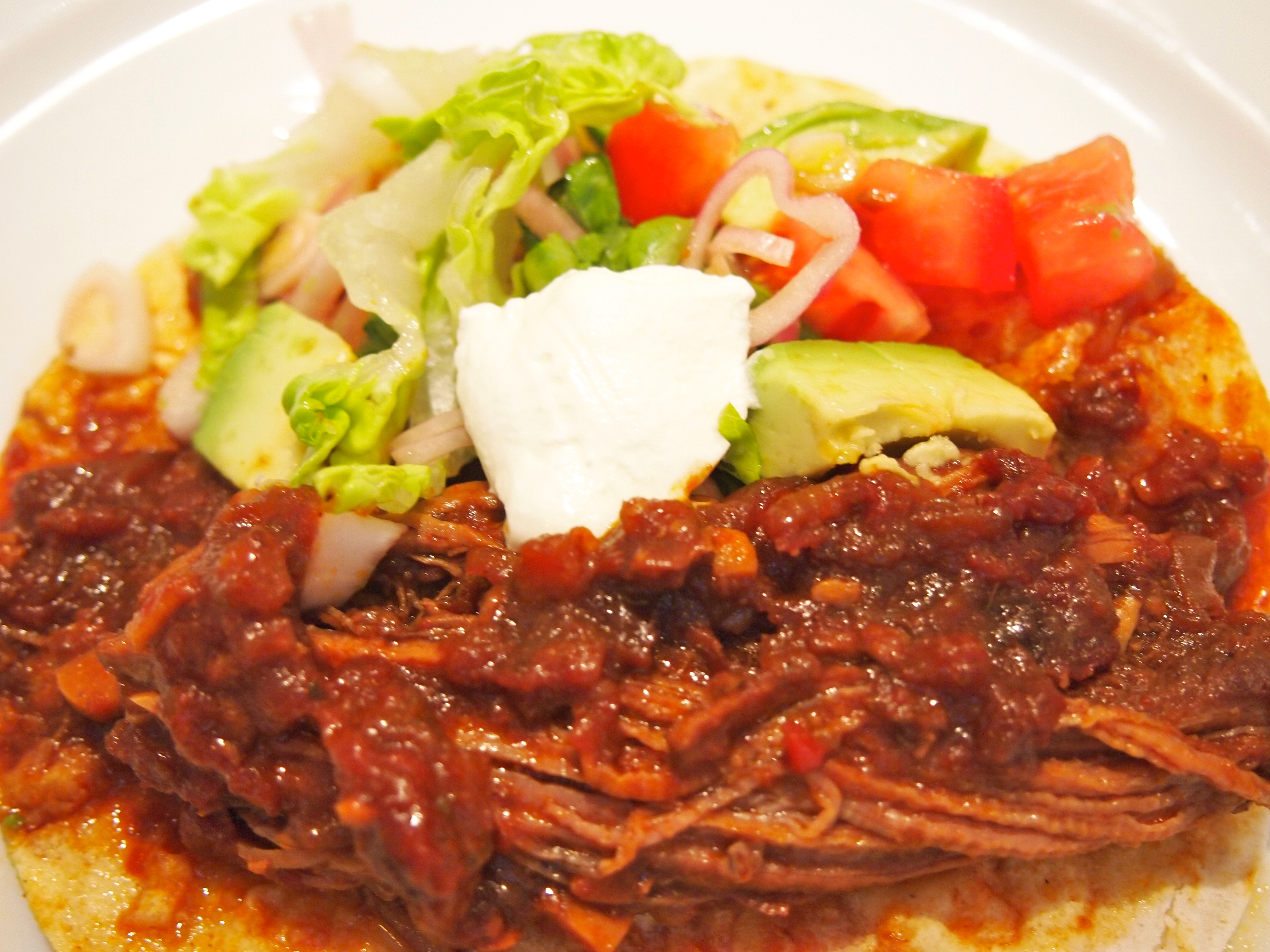 For some reason we always seem to crave Tex-Mex food on a Friday night. There’s something so festive about this style of food which makes it a great celebratory introduction to the weekend. I’ve never cooked a whole brisket before, mainly because it’s not a cut that’s commonly seen in butchers here. It’s never on display, well not at the butchers near me, but it is a cut they’ll prepare for you if you pre-order it. The other option is to purchase it from the Kosher meat section of the supermarket where it’s in plentiful supply but at a rather hefty cost, and that’s not what brisket is all about. My butcher prepared a nice large brisket for me that weighed about 1.5kg. It was quite thin on both ends which scared me a little as I was sure it would become tough but I needn’t of feared. It was pull apart tender and the chipotle spiked chill sauce which coated it made it even better. I pulled the brisket apart and smothered it in the sauce and then used it as a filling for white corn tortillas with all the usual fixings of avocado, tomato salsa, sour cream and cheese. This makes a lot of brisket but it freezes well and tastes even better the second time round.
