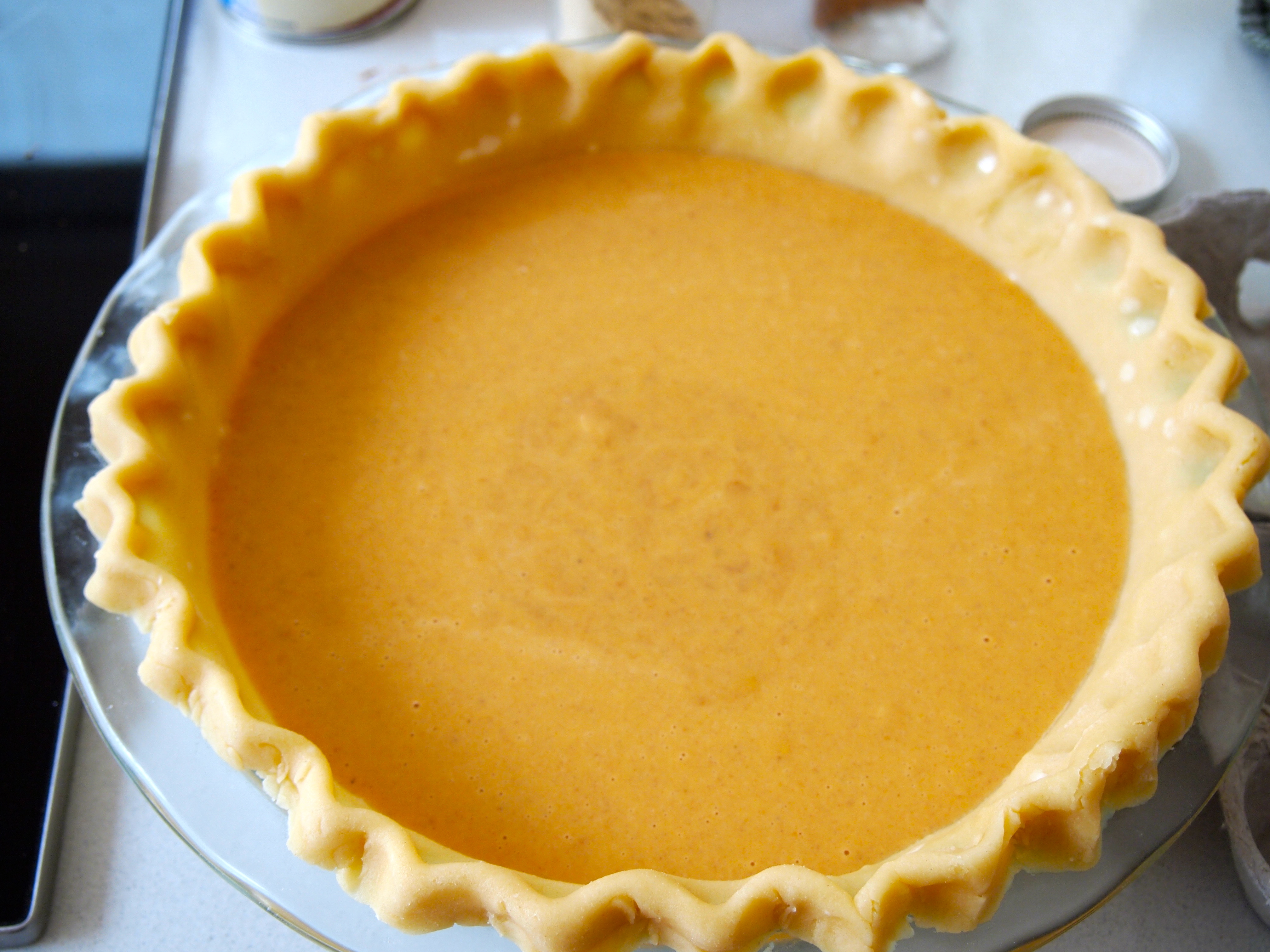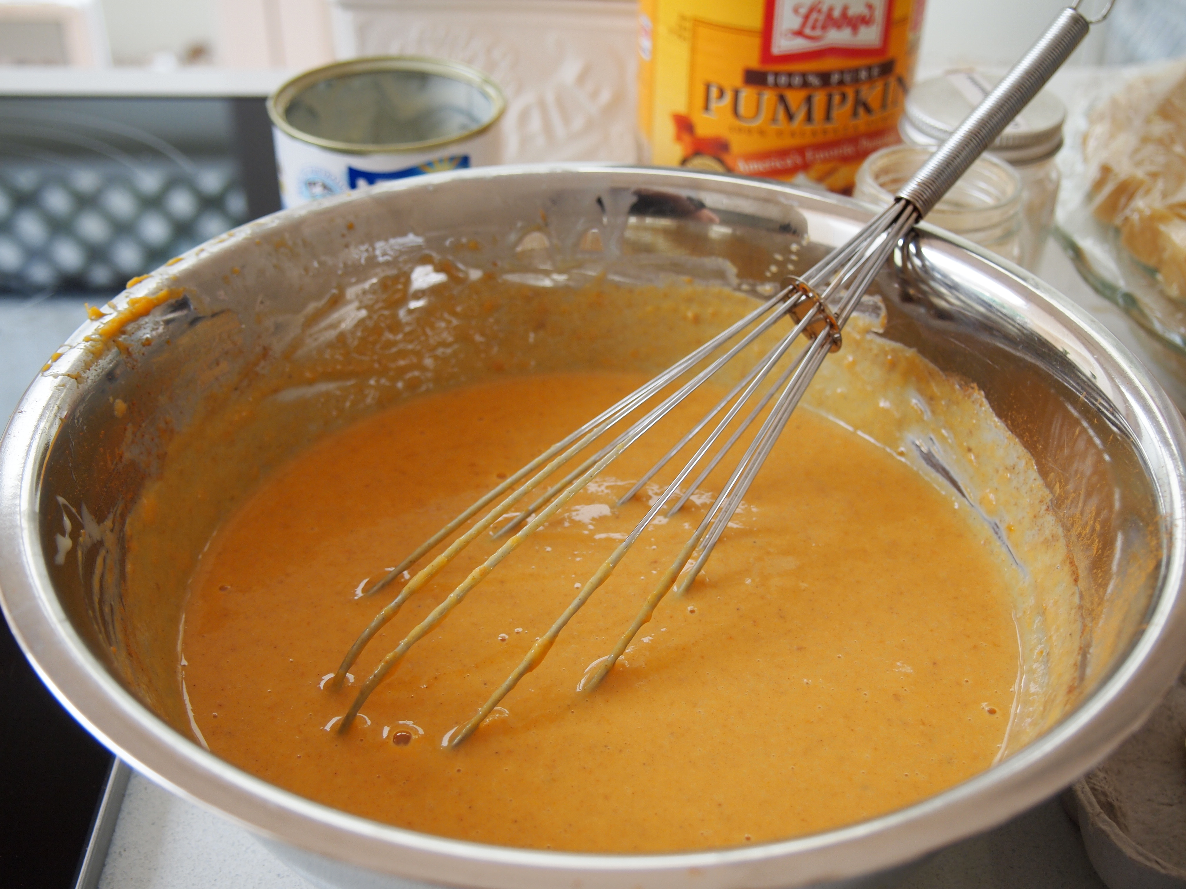 Preheat oven to 210C. To make the filling put the pumpkin puree into a large bowl. Add the egg and egg yolks and whisk to combine. Add the condensed milk and whisk to combine again. Add the spices and give it a final whisk to make sure everything is well distributed.