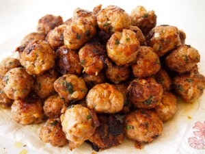 To make the meatballs heat a little butter in a small fry pan, add the onion along with a pinch of salt and cook until soft. Leave aside to cool. Place all the other ingredients, other than the olive oil and flour, into a large bowl and add the cooled onions. Using your hands, where disposable gloves if you wish, combine the mixture thoroughly. Take small amounts of the mixture and form into balls, I like walnut size balls but make any size you wish. Heat some olive oil in a large fry pan over medium high heat. Lightly dust some meatballs with flour and place into the hot oil. Place enough meatballs into the pan to form a single layer. Cook turning occasionally until the meatballs are nicely browned on all sides. Repeat with the remaining meatballs, adding more oil as needed.