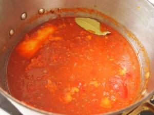 To make the sauce heat the oil in a large heavy based saucepan over medium heat. Add the onions and a pinch of salt and cook for about 5 minutes until slightly softened. Add the carrots and cook for a further 10-15 minutes until caramelised and golden. Add the garlic and cook for a few more minutes. Add the red wine and bring to the boil and reduce by half. Add the chilli flakes and canned tomatoes, swirling some water into each can and adding it to the sauce. Add the chicken stock, parmesan rind, salt, sugar, tomato paste and bay leaf. Bring to the boil, then cover and reduce the heat to a gentle simmer.
