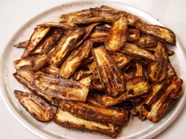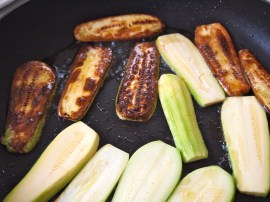I prefer to start with the frying of the zucchini and this step can be done a day or two in advance to makes things easier.  If you’re using the small grey Lebanese zucchini you will need to peel them first. Regular zucchini can be just washed and left unpeeled.  Slice the zucchini lengthways into ½cm slices, you don’t want them too thick. Heat enough oil to generously cover the base of a large non stick frypan over medium heat and when hot put in enough zucchini slices to cover the base of the pan in one layer.  Fry until the bottom of the zucchini are golden brown, not just light brown but really golden brown,  this can take about 5 minutes or more depending on how high your heat is. Turn the slices over and cook the other side until also golden brown. Remove and set aside on a plate and continue with the rest of the zucchini, adding more oil as necessary. Sprinkle each round of zucchini once they have been browned lightly with salt.
