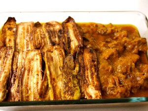 To make the base of the khoresht, heat a good amount of oil, at least a quarter of a cup in a heavy based saucepan over medium heat.  Add the onions and cook string frequently until golden brown and caramelised.  You may need to add more oil, it’s a lot of onions. You want to take your time with this step as it’s going to make a big difference to the end flavour and colour of the dish.  It should take about 20 minutes for the onions to be cooked and you may need to adjust your heat between medium and medium-low to prevent the onions burning or browning too quickly without getting soft and sweet. Add the turmeric and stir it into the onions and cook for a few more minutes. Whilst the onions are cooking place the diced lamb into a large bowl and rinse a few times with cold water.  I know this sounds odd but it removes any impurities from the meat and gives the sauce a cleaner flavour. Drain the meat in a colander and dry lightly using some kitchen paper. Once the turmeric has been added to the onions, increase the heat to medium high and add the meat; cook stirring occasionally until the meat has changed colour.  Add 1½ teaspoons salt and ½ teaspoon pepper and mix well.  Bring a kettle to the boil and add enough boiling water so as just the tops of the lamb are peeking through.  Bring to the boil, reduce the heat to a simmer and cover the pan.  Cook for one hour or until the meat is half cooked. After this time remove the lid and add the lemon juice.  Take out some of the sauce and place into a small bowl and add some of the end sections of the zucchini, about 8 small slices, into the bowl and mash it into the sauce. Add this back to the saucepan and taste for seasoning, adding more salt if necessary – you’ll be surprised at how much salt this dish can take. Replace the lid and cook for a further hour to hour and half, checking to make sure that the sauce isn’t running too dry.  I usually find that I need to remove the lid for the last 20 minutes of cooking time as you want the sauce to be quite thick. Once the lamb is completely cooked and fork tender take an ovenproof baking dish and lay at least a third of the fried zucchini on the bottom of the dish. Pour the sauce over, reserving a few spoons of juice. Top with the remaining zucchini.