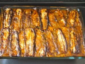 Spoon the reserved juice over the top and place in a 160C oven for anything up to 2 hours but a minimum of 1 hour.  Check occasionally to make sure the top isn’t burning and if it is getting too dark place a sheet of foil over the dish.  You do want however to achieve a nice golden colour on top, almost too dark,but not burnt.  Serve hot or bring to room temperature and then freeze or refrigerate.  It can be reheated in a low oven for 30 minutes until hot.