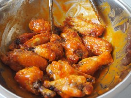 When the wings have finished cooking place them into a large bowl and whilst they are still screaming hot from the oven pour the hot sauce over them and toss to coat well with the sauce. Place on a platter and serve with the blue cheese dip and celery sticks.