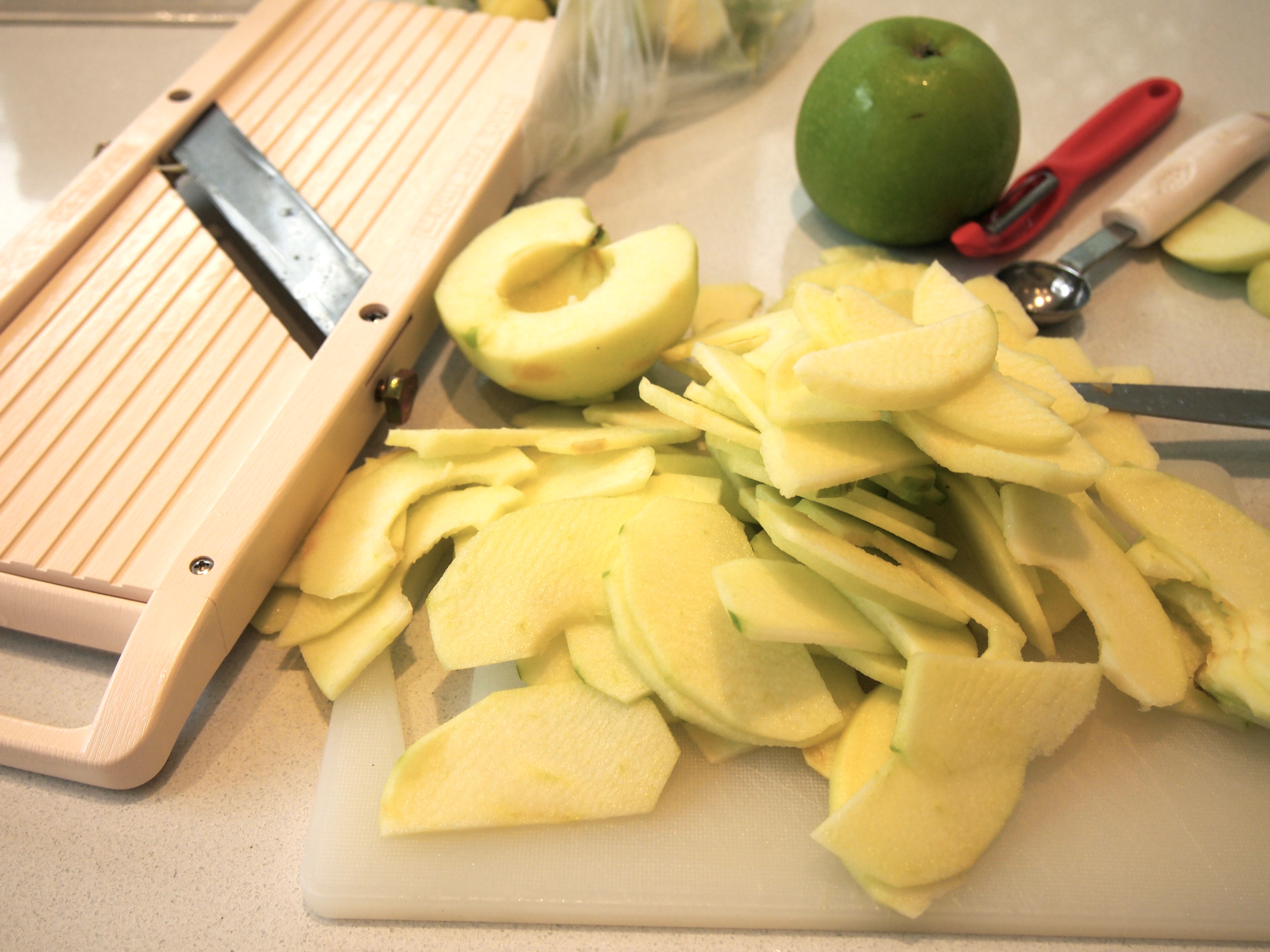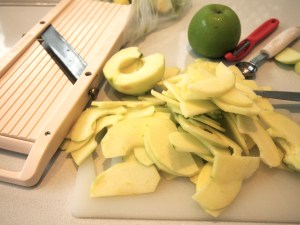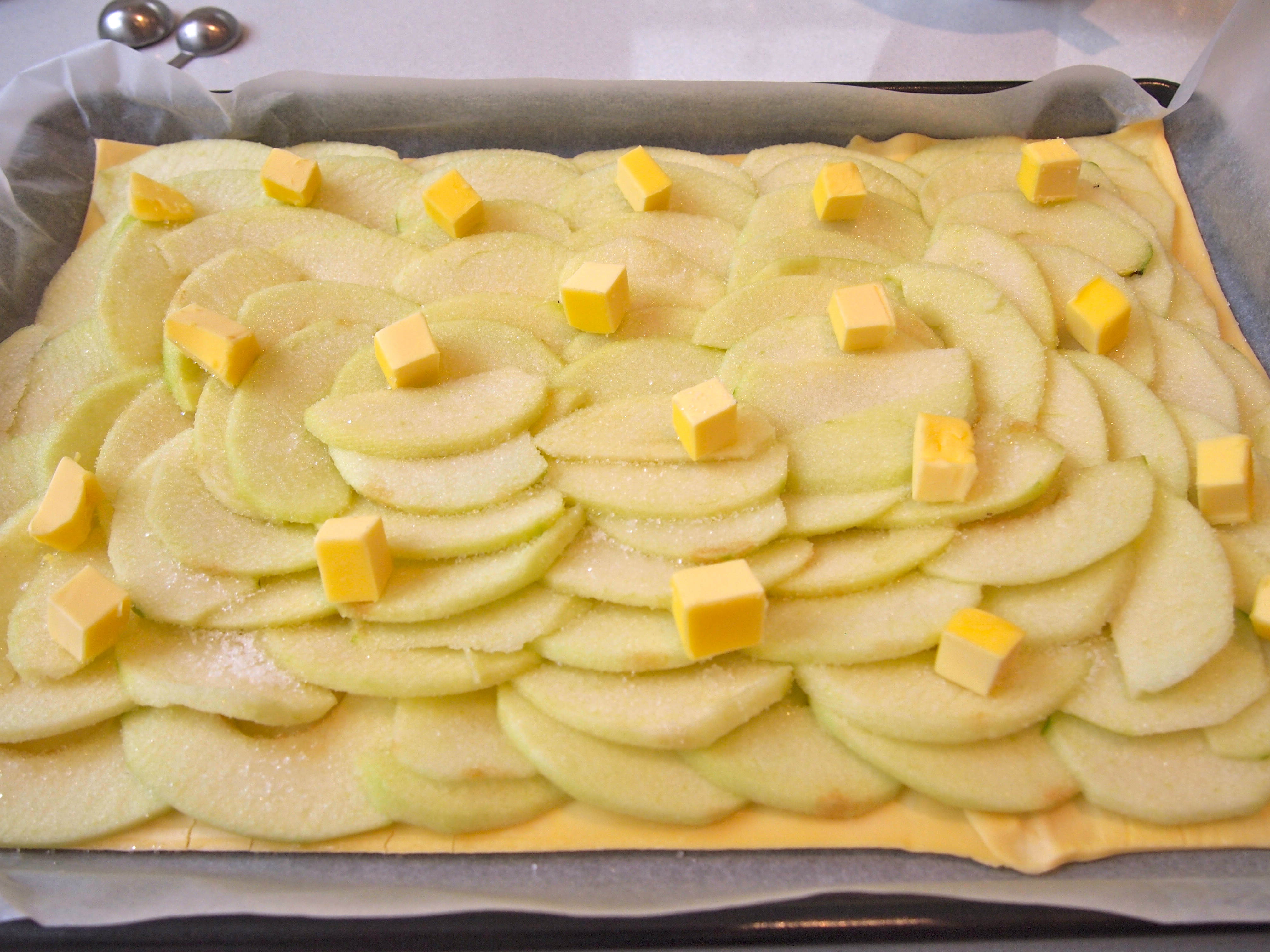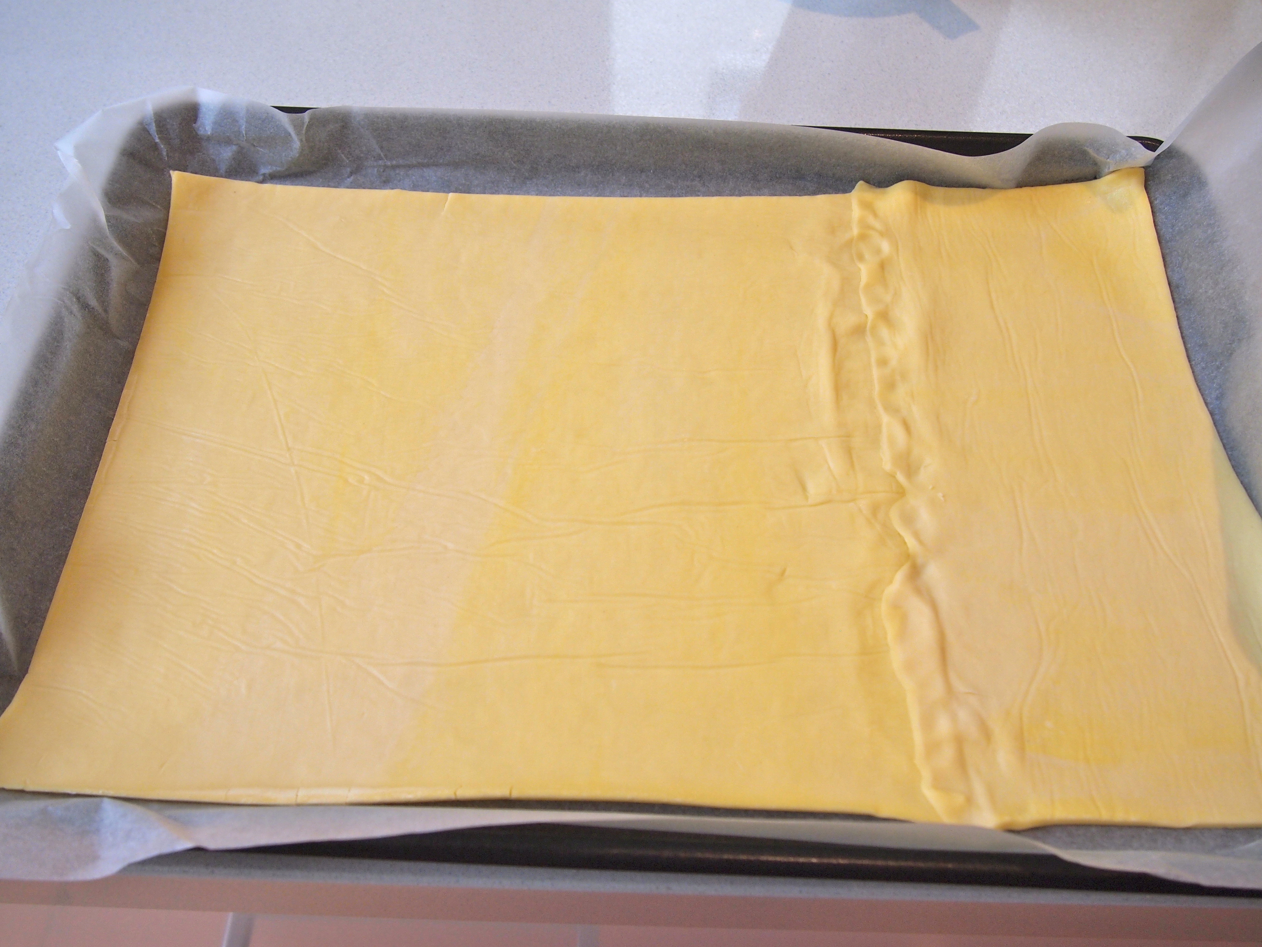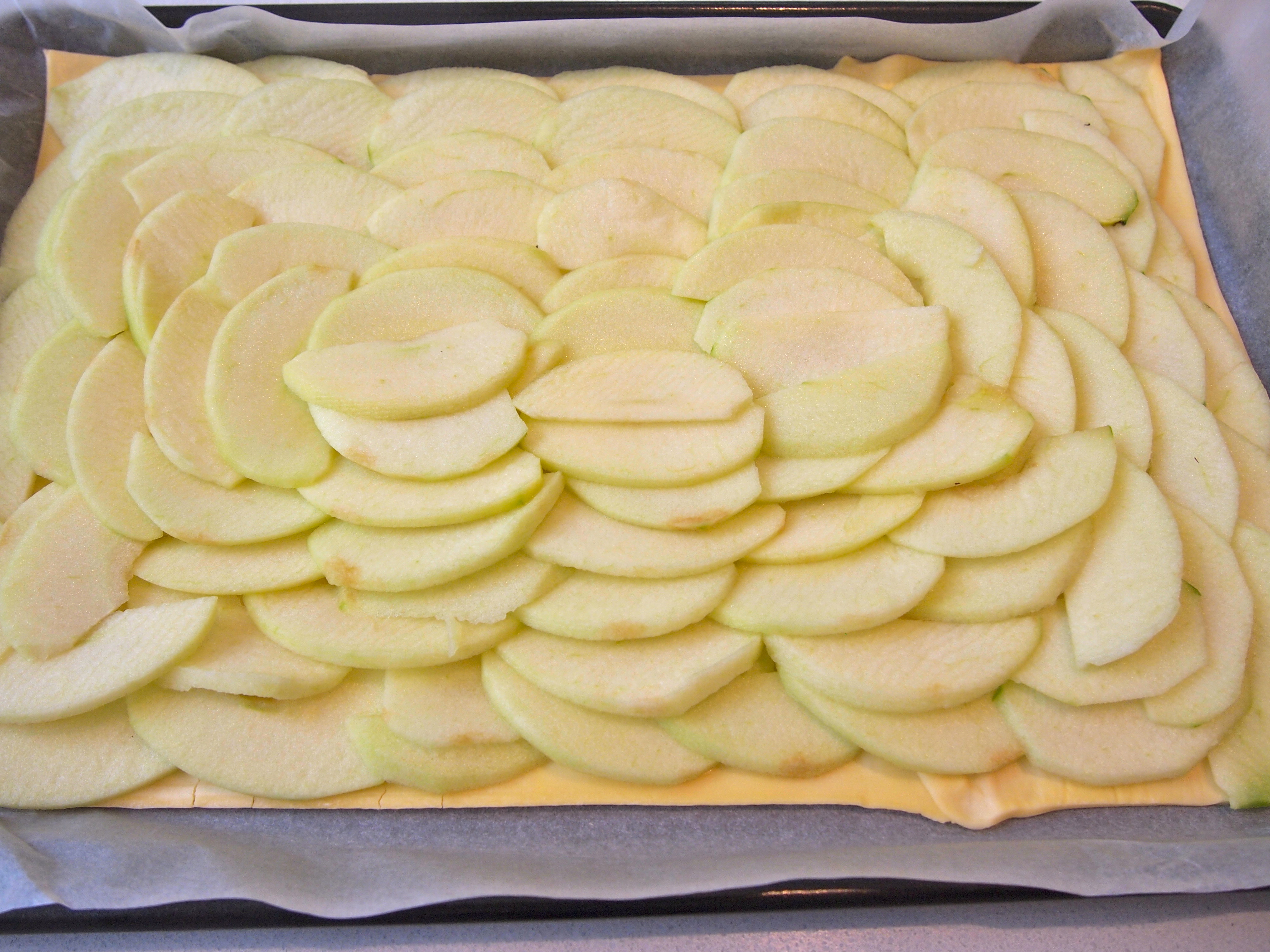 Heat oven to 200C. Line a rimmed baking sheet or jelly roll pan with parchment paper. The ideal size is a 10×15-inch jelly roll pan. If you’re using a block of pastry then roll it out on a lightly floured board to the size of the jelly roll pan. I used ready rolled puff pastry as it’s the only all butter pastry my supermarket sells. In which case you’ll need to do a bit of a cut and paste job as in the picture below. Carefully transfer the pastry onto the parchment paper and put back into the fridge while you prepare the apples.