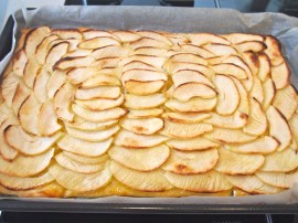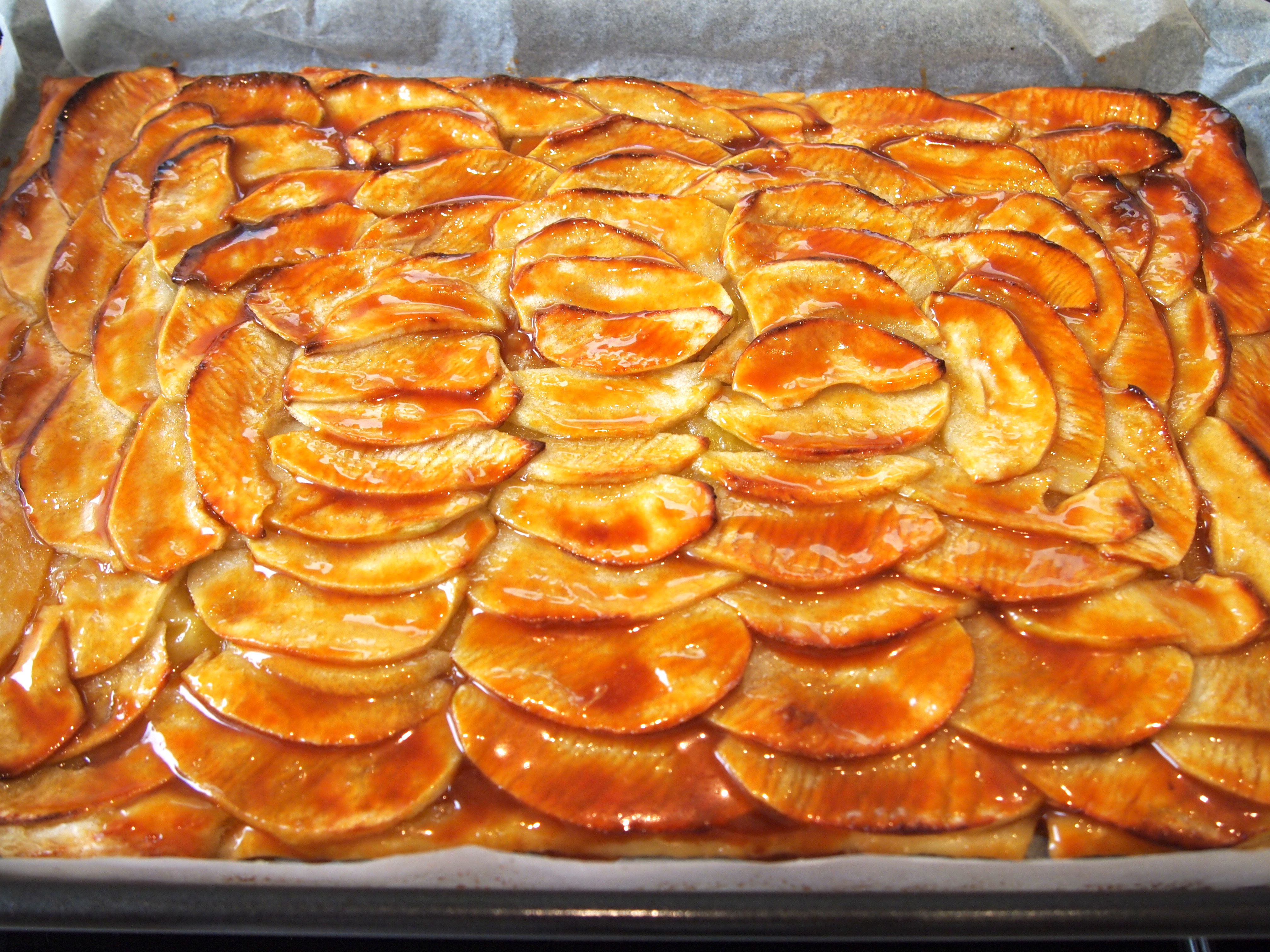 After the tart has baked, remove it front the oven. Using very short, gentle strokes, and brushing in the direction that the apples fan to mess up their design as little as possible, brush the entire tart, including the exposed pastry, with the salted caramel glaze. You might have a little leftover. Return the apple tart to the oven for 5 to 10 more minutes, until the caramel glaze bubbles. Let tart cool complete before cutting into squares. Serve plain, with coffee or tea, or with a scoop of vanilla ice cream, for dessert.