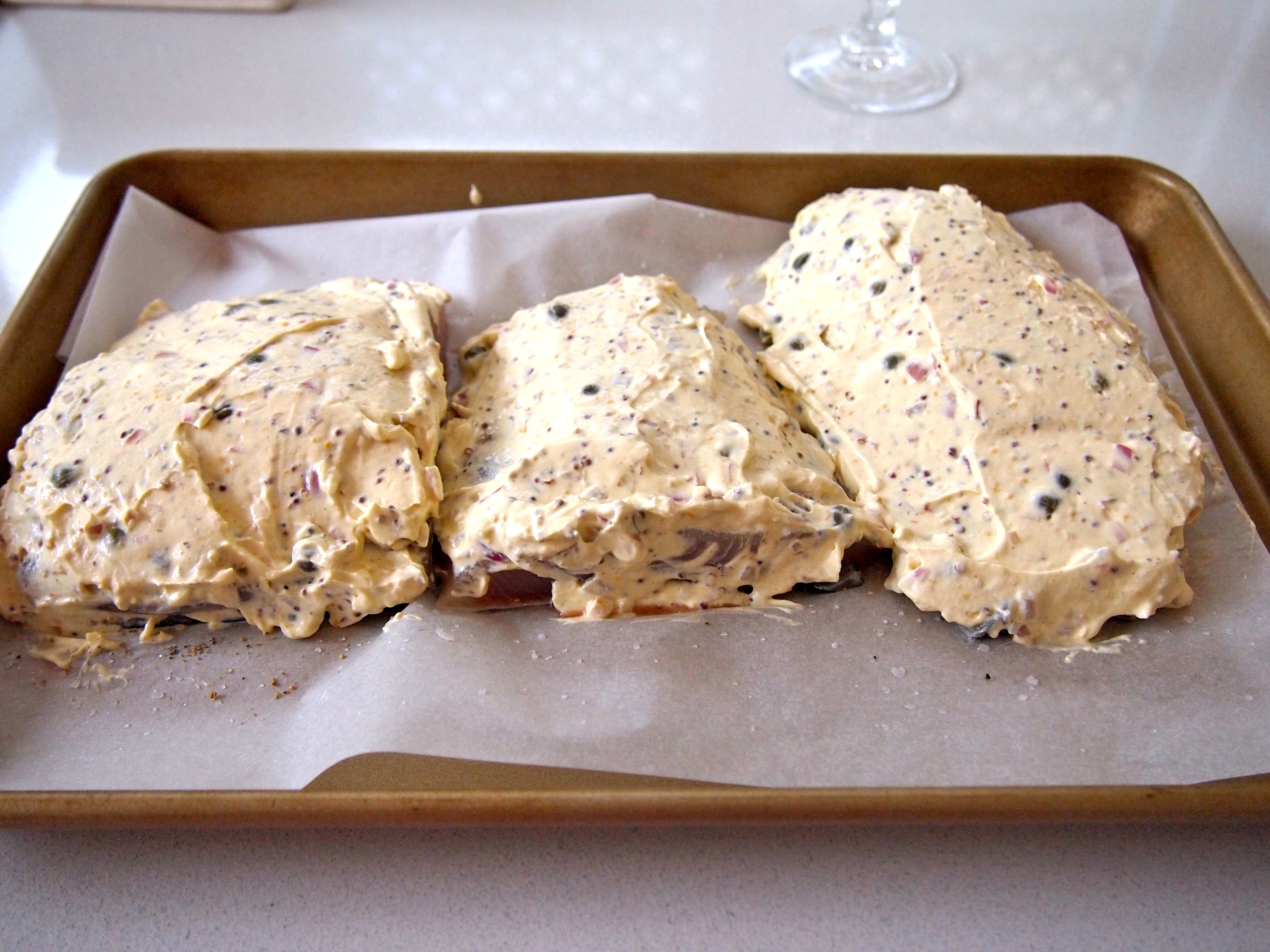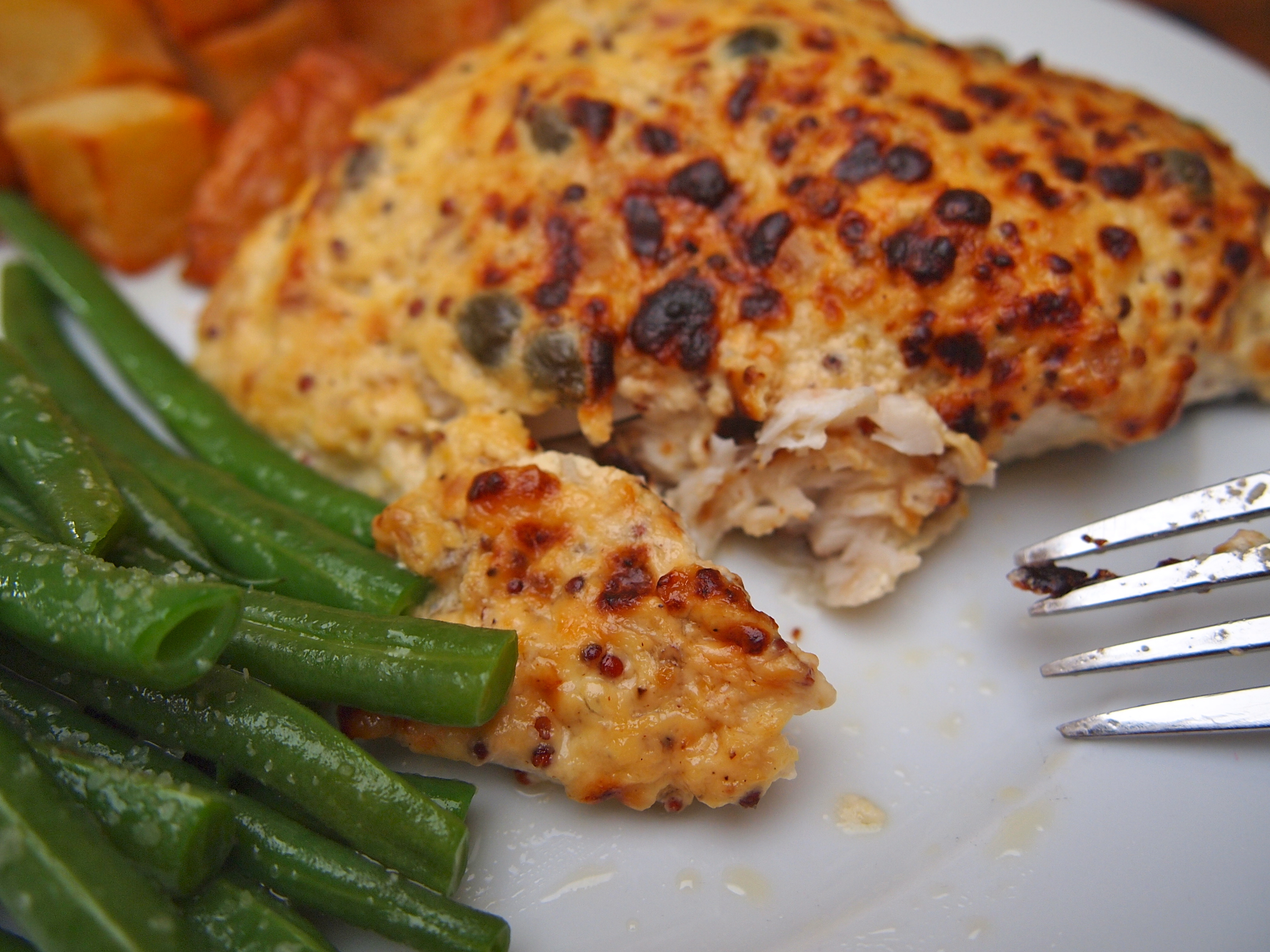 My husband recently went on a fishing trip with some friends and came back proudly bearing four enormous kingfish fillets. Thankfully they scaled, gutted and filleted the fish they caught before bringing them home otherwise I might not have been as happy to have them. It’s the first time I’ve eaten fish that’s been caught so recently and the difference in flavour, texture and aroma (i.e. it has no, and I mean no, smell at all) is huge compared to fish that you buy from the fishmonger or even the fish markets. Two of the fillets I cooked very simply by flouring and pan frying them with a little butter, lemon juice and parsley. But I wanted to try something a little different for the last two fillets and decided to make Ina Garten’s mustard roasted fish from her Back to Basics cookbook. This was a great way to prepare fish and don’t be put off if you’re not big mustard fan as it’s not a prominent taste in the finished dish. This meal is so quick and easy to prepare and a lovely change from the way we normally cook fish. To be able to get dinner on the table in thirty minutes (and only use one baking tray and a small bowl) and have it look and taste this good means this will be a recipe I’m going to be making often.