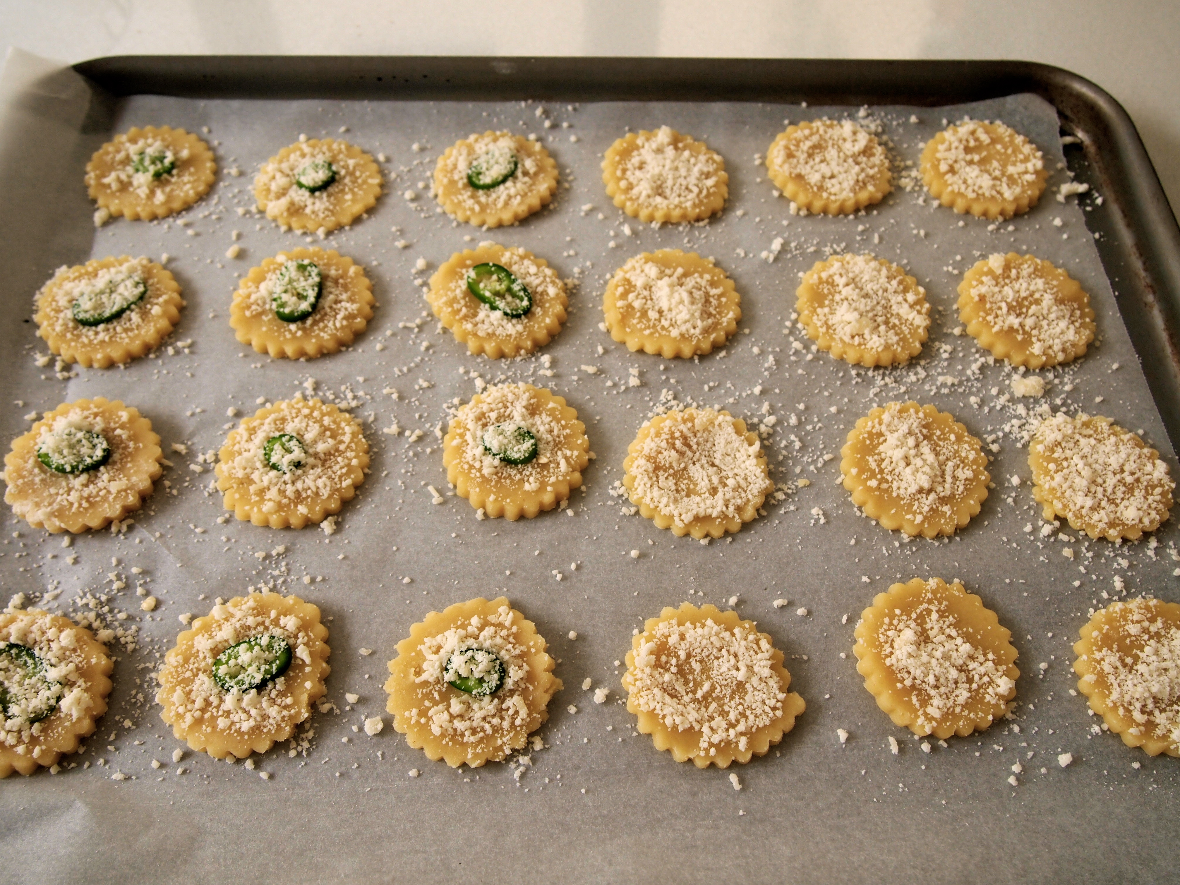 Simon Hopkinson's Parmesan BiscuitsI can’t tell you the number of recipes I’ve made from Simon Hopkinson’s recent television series the Good Cook. Somehow I’m much more tempted to try recipes after watching someone cook it than I would be from just reading the same recipe in a cook book. Hence the popularity of cooking shows I guess. That enhanced understanding you have of the finished dish and the chefs passion towards it can’t be replicated too easily in written form. Take these parmesan biscuits as an example. There are so many recipes for cheese biscuits and most of them are pretty similar but watching them being cooked by Simon Hopkinson I couldn’t wait to try them and I just knew they were going to be one of the better parmesan biscuits out there, and I was right. These are a lovely appetiser to serve with a glass of wine or Champagne – the ones topped with green chilli were my favourite, with a wonderful spicy kick. I must admit that I forgot to brush the biscuits with egg wash prior to baking but they didn’t seem to suffer for it although they may have had more of a golden glossy finish if I had. These are as fun and satisfying to make as they are to eat and will keep in an airtight container for at least a few days but they never seem to last that long.
