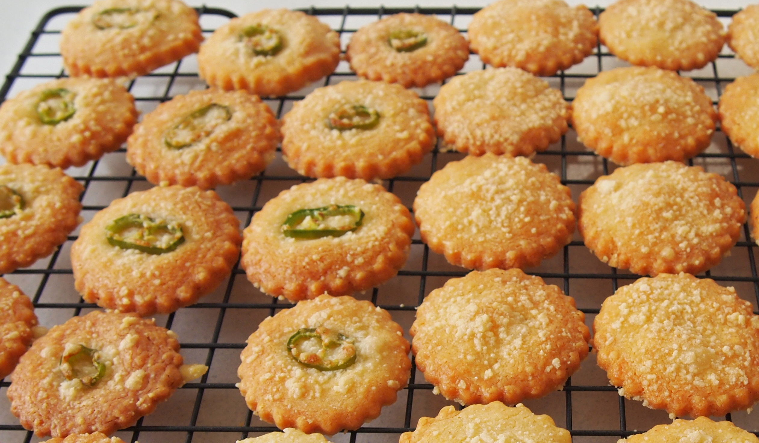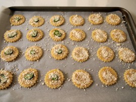 Lay them out on a greased baking tray about 2cm apart – it may take two lots of baking to use up the entire mixture. Carefully brush the surface of each biscuit with the egg and sprinkle over a little finely grated parmesan. If you’re using the green chilli place a slice of chilli on each biscuit (or just some of them)  prior to sprinkling with parmesan. Bake for 10 minutes, or until they are a golden-brown colour. Carefully lift the biscuits off the tray using a palette knife and place on a rack to cool.
