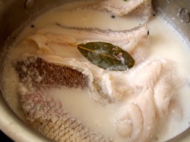 To make the fish cakes bring the milk, bay leaves, peppercorns and salt to a boil. Lower heat to a gentle simmer and add the fish. Cover and cook for 10 minutes, or until the fish is just cooked. Remove the fish from the milk and leave to cool. Once the fish is cool enough to handle remove the skin and gently flake the fillets into large bite size chunks, set aside.