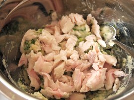 Put the mashed potatoes, spring onions, lemon zest, parsley, dijon mustard, 1 teaspoon salt and a generous pinch of black pepper in a bowl and mix until well combined. Taste and make sure it’s seasoned well. Add ¼ of the fish and beat it firmly into the potato mixture. Add the rest of the fish and this time very lightly and gently work it through so as the flakes remain as whole as possible. Place the mixture in the fridge for 10 minutes to firm up.