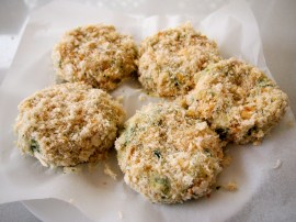 With slightly dampened hands take a handful of the mixture and form it into a thick patty. The size should be roughly 10cm in diameter and about 2 cm thick, but you can of course make them smaller if you wish. Repeat with the remaining mixture. You should end up with 5-6 cakes.