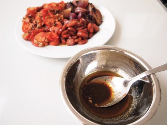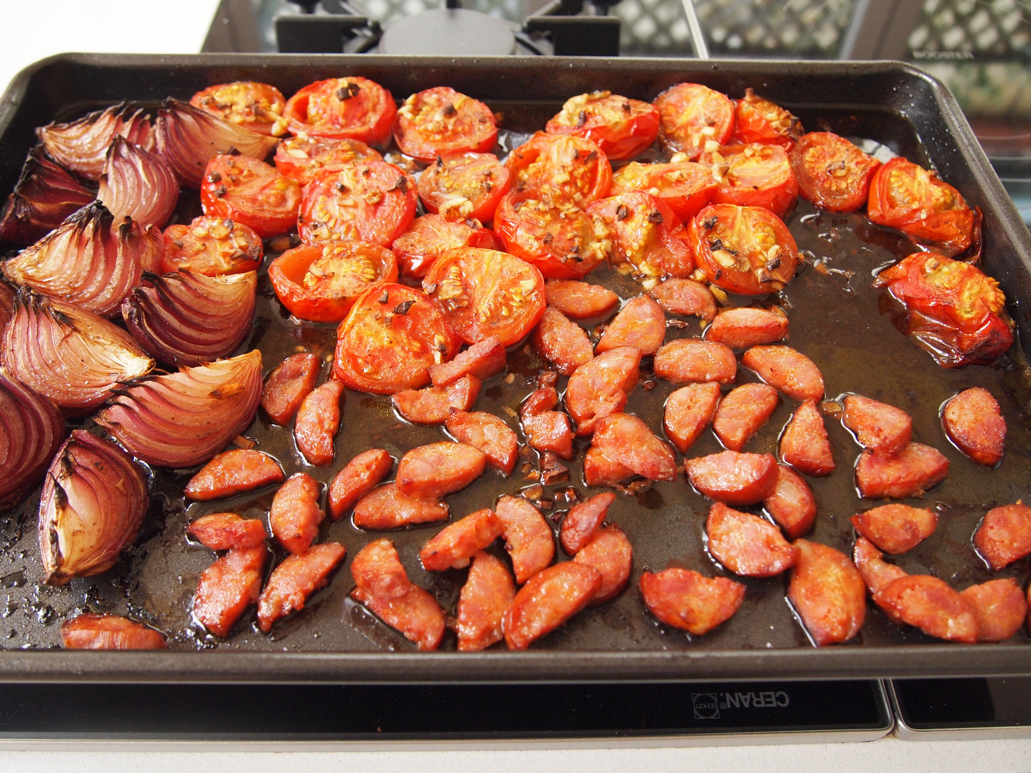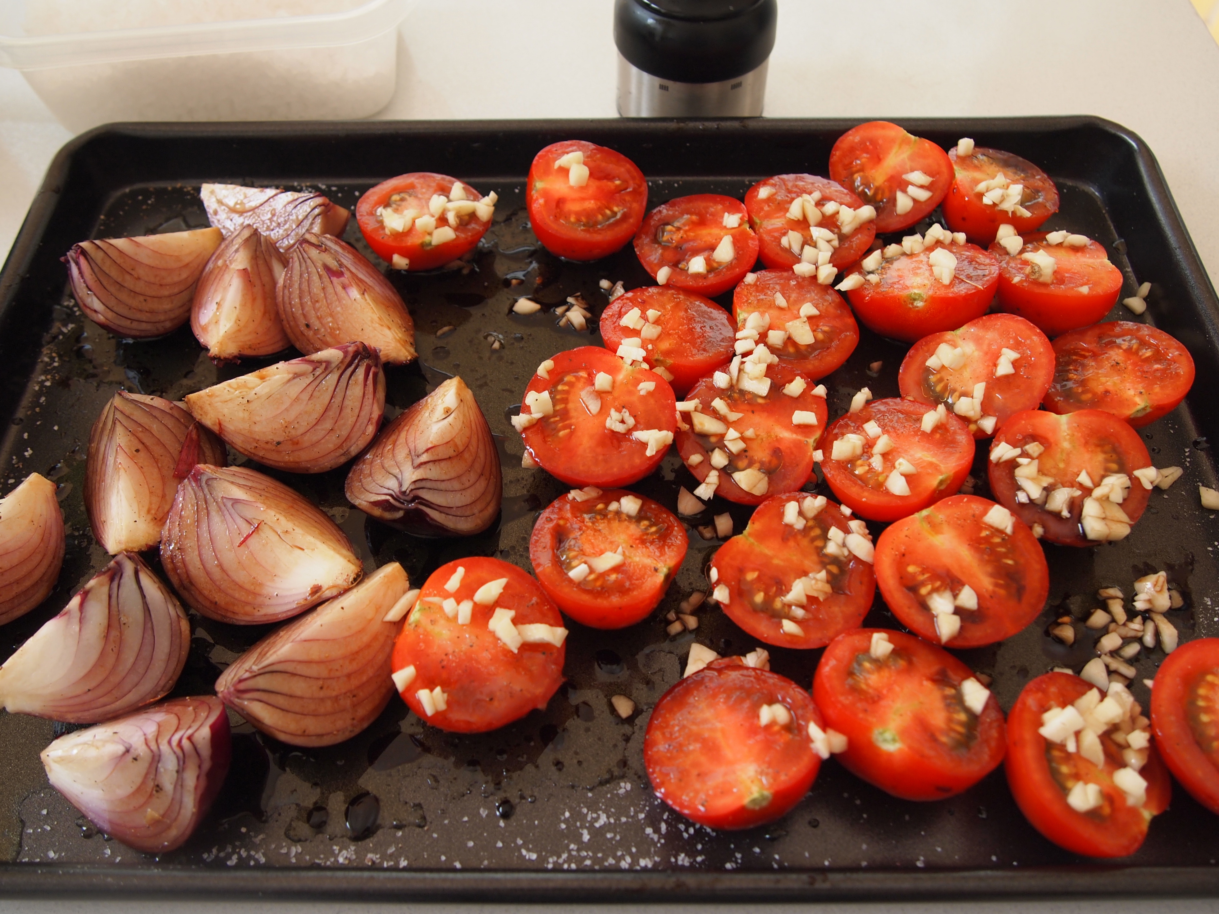 Preheat oven to 170C. Place the tomatoes and onions on a baking tray, keeping them both separate. Season each with salt and pepper and drizzle generously with olive oil and the balsamic vinegar – the balsamic and oil in the tray will be used to make the dressing later so don’t worry if you think there’s too much. Add the garlic to the tomatoes and toss the tomatoes and onions lightly to coat them in the oil and vinegar but still keep them separated on the tray. Place in the oven and roast for 30 minutes. Add the chorizo to a spare spot on the tray and increase heat to 200C and roast for a further 10 minutes or until the onions and chorizo are crispy and golden. Remove from the oven and drain off all the juices from the tray into a small bowl.