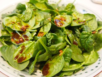 Whilst the vegetable and chorizo are roasting place the spinach leaves in a large salad bowl or platter. You should have been able to retrieve a good amount of oil and balsamic from the roasting tray but if there isn’t enough to make a dressing add a little more balsamic and a splash of oil and whisk well. Check seasoning and then pour over the spinach leaves; just add as much as you need to lightly coat the leaves, don’t drown them in dressing. Gently toss through the warm tomatoes, onions and chorizo and add a little more dressing, Serve straight away whilst still warm.