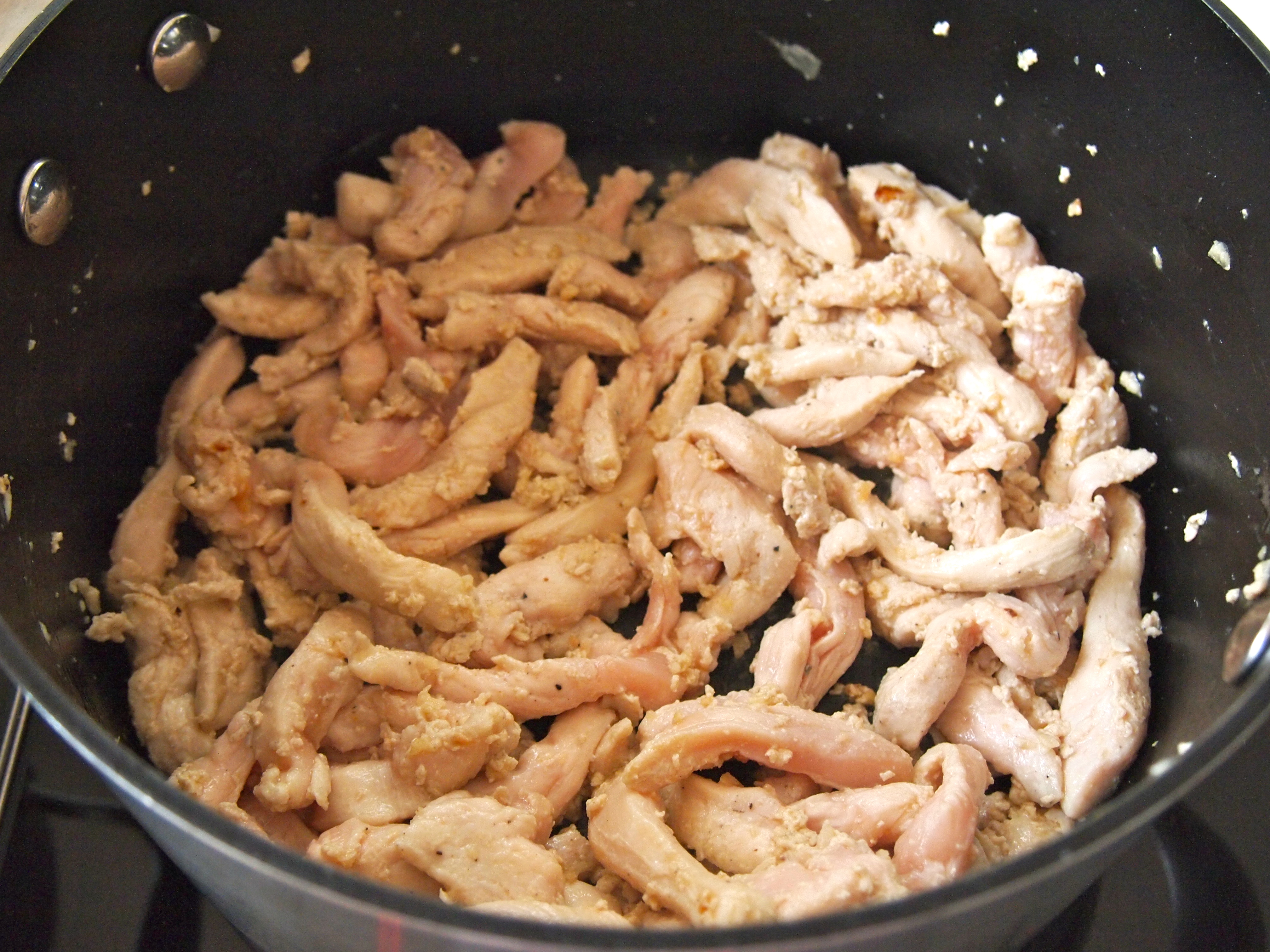 2 large or 3 small chicken breast fillets, shredded into thin 1cm sliced